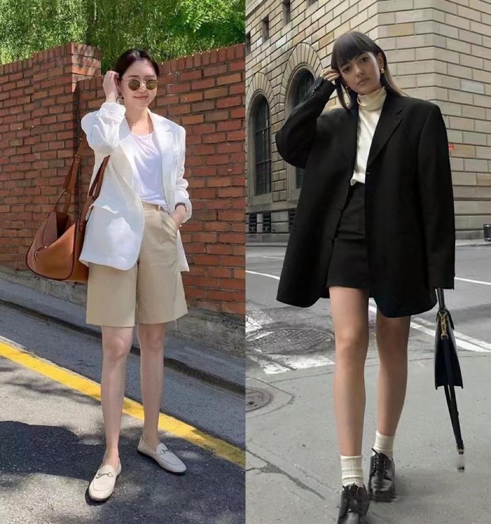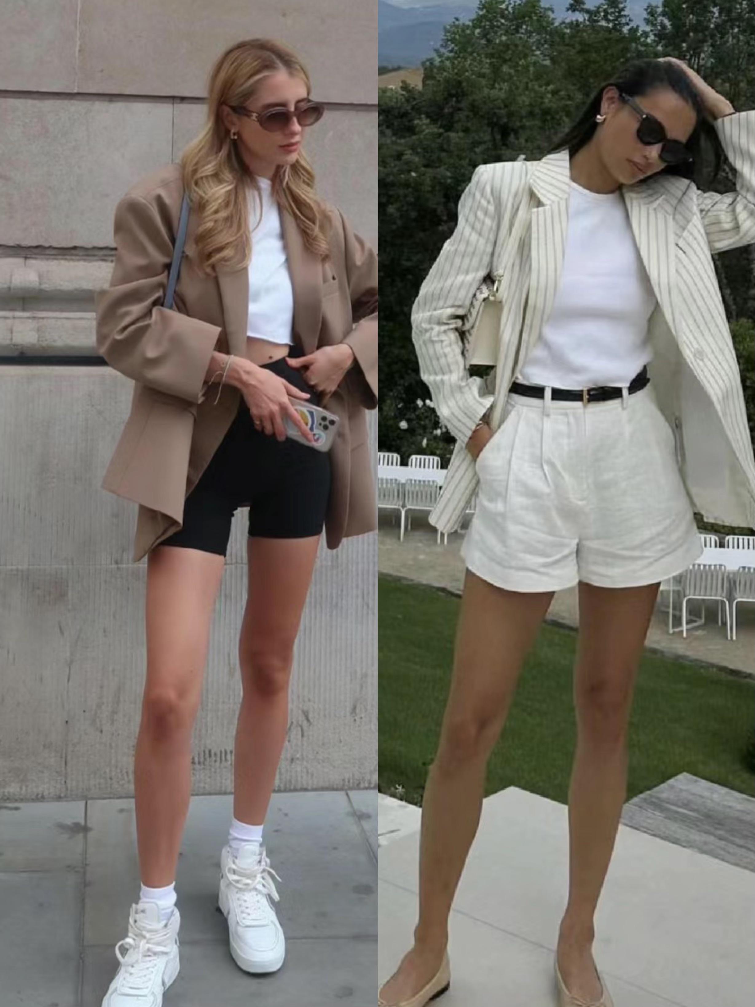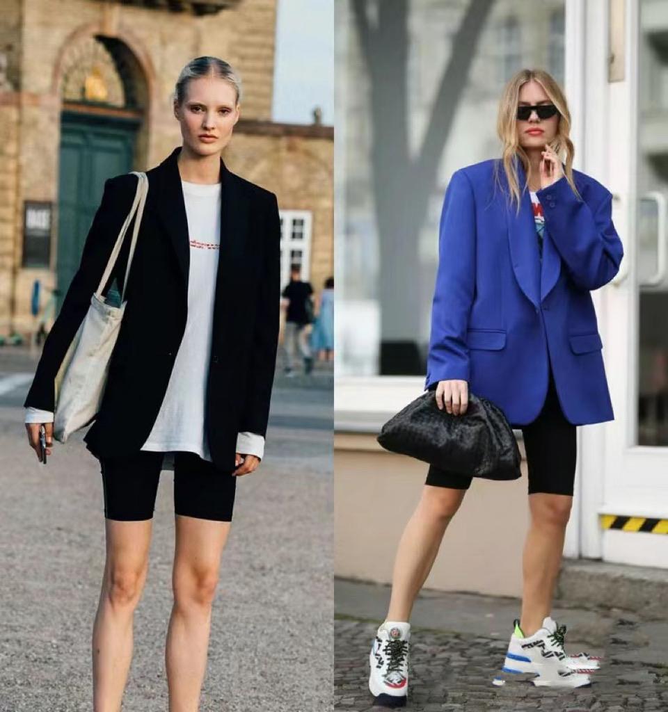 西裝+短褲的穿着方式,不僅風格上更加百變。而且也是一種大方又不挑人的穿着模板,寬鬆的西服外套,配緊身的瑜伽短褲也很利落。