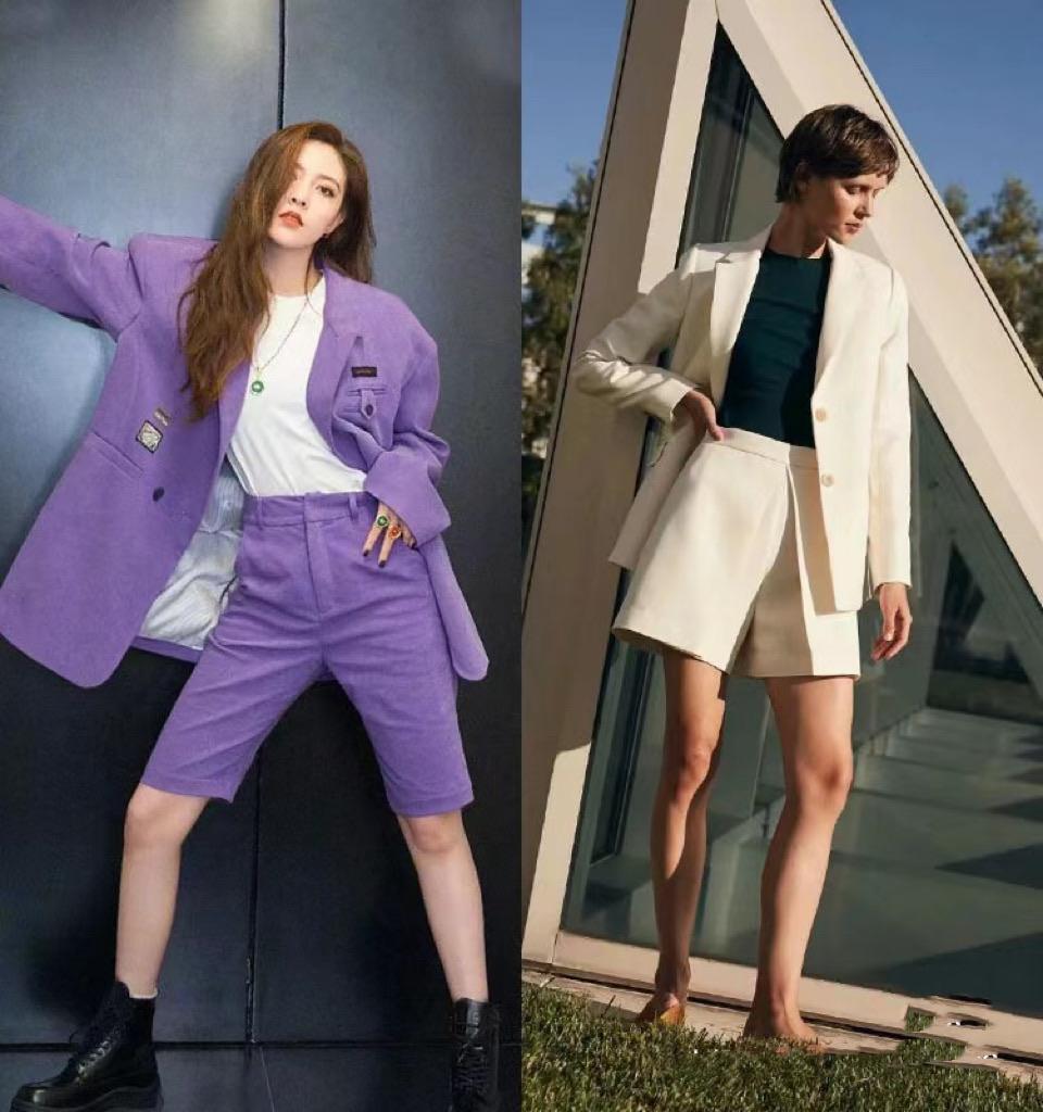 與西服外套同色、同面料的短褲,也可以說是西裝同款短褲。這一種穿搭主要表現出高級、酷颯的美,很醒目也很大方。