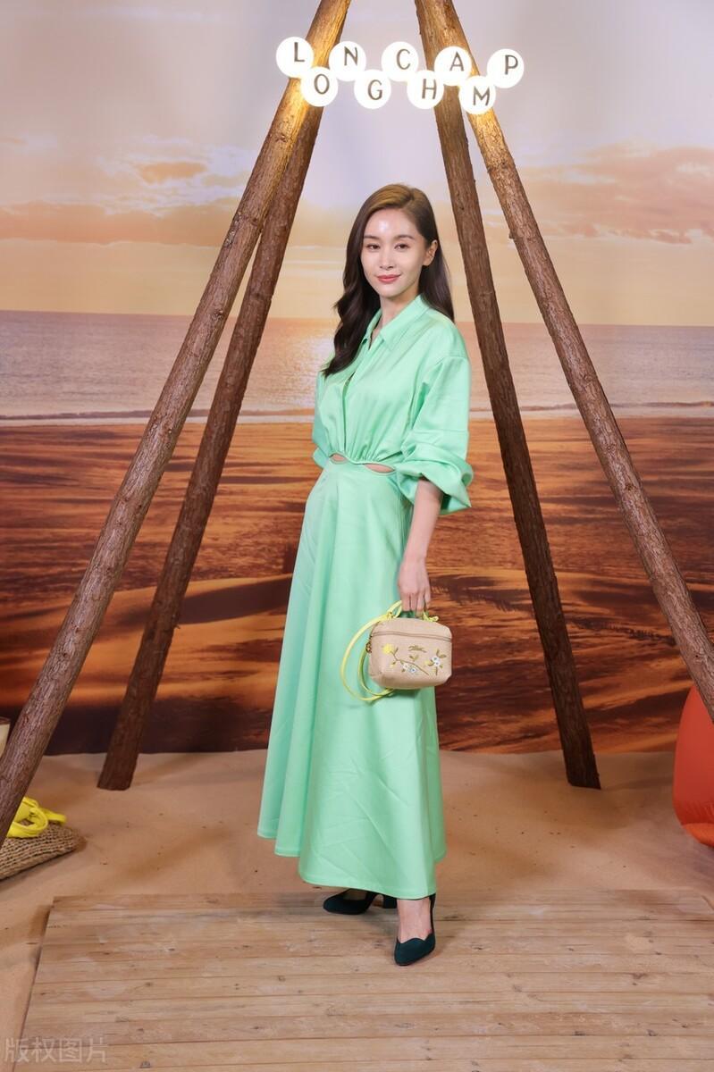 一條綠色系的襯衫裙,格外的清爽又醒目。小個子的王子文,穿着襯衫裙自然要配尖頭高跟鞋。