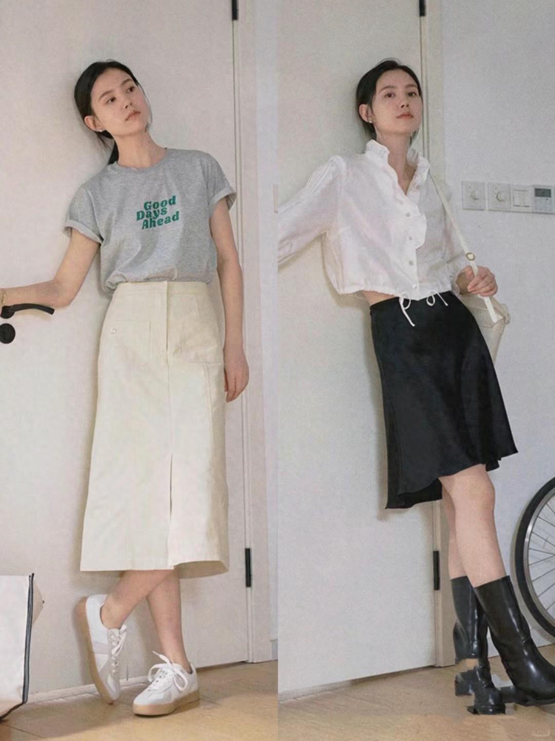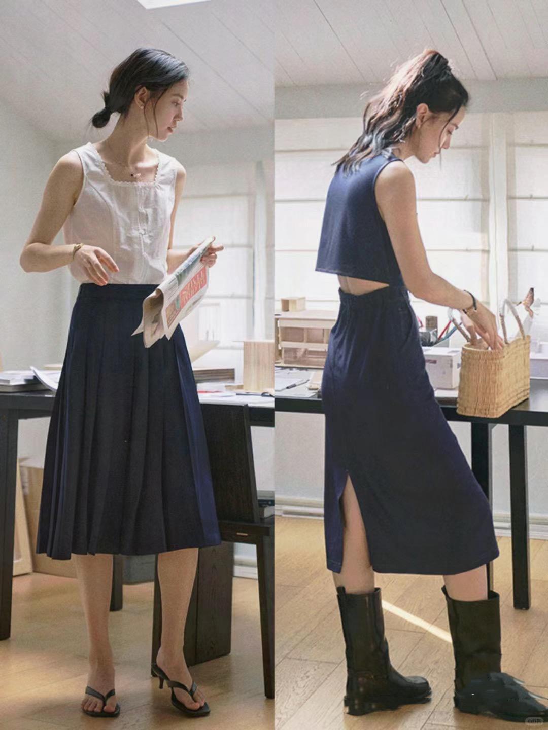 修身一點的小背心,剛剛露臍的長度,可以配高腰的百褶半身裙或者開叉半身裙來穿着。尤其是高腰的百褶半身裙,既耐看又具備了包容性,梨形身材也可以完美駕馭。