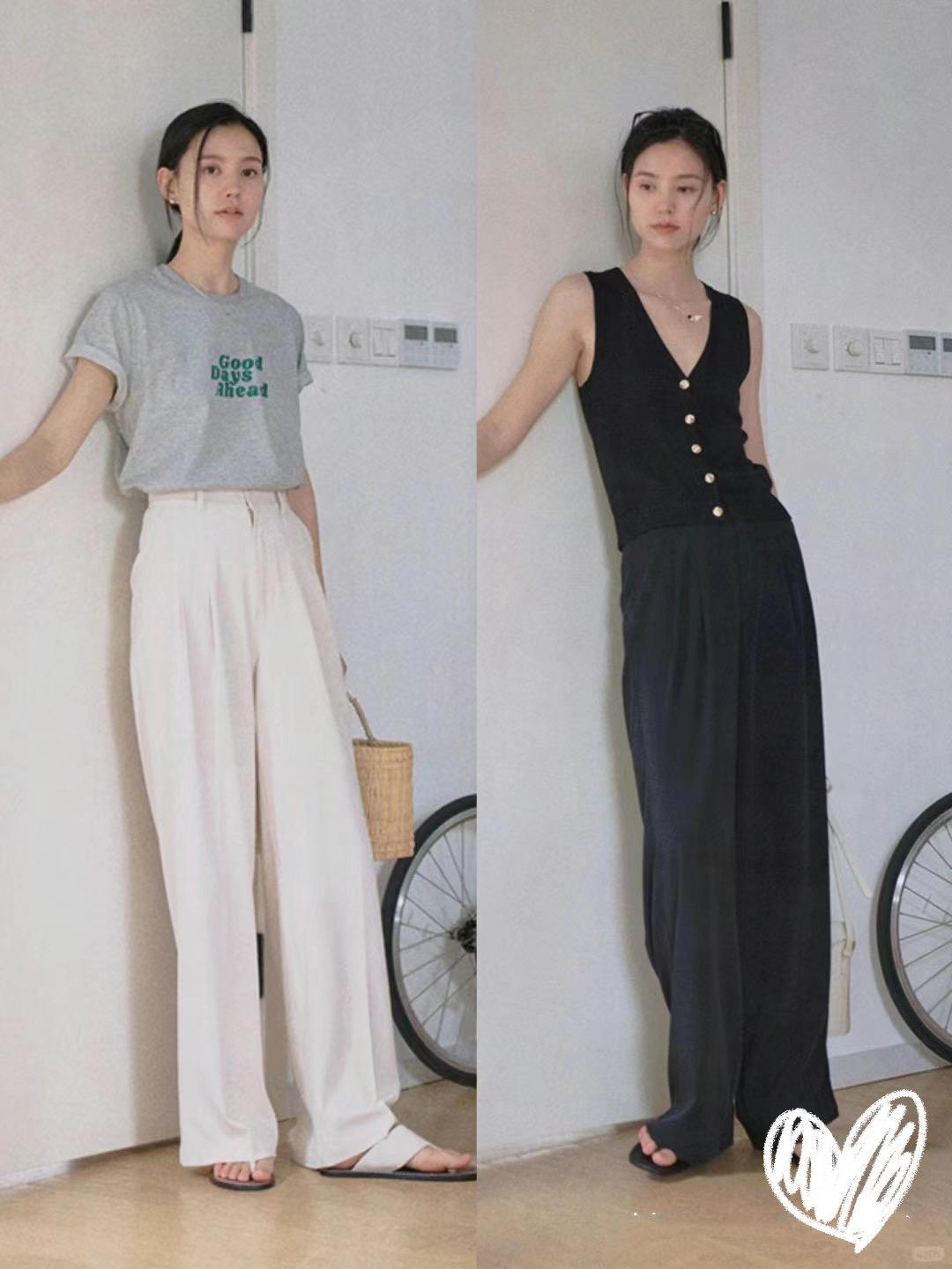 小飛袖T恤+高腰闊腿褲的組合,選擇了灰白配色、簡約又美好。白色系的高腰闊腿褲,將腰線自然的抬高。輕盈且垂順的白色闊腿褲,可以顯得雙腿筆直修長。