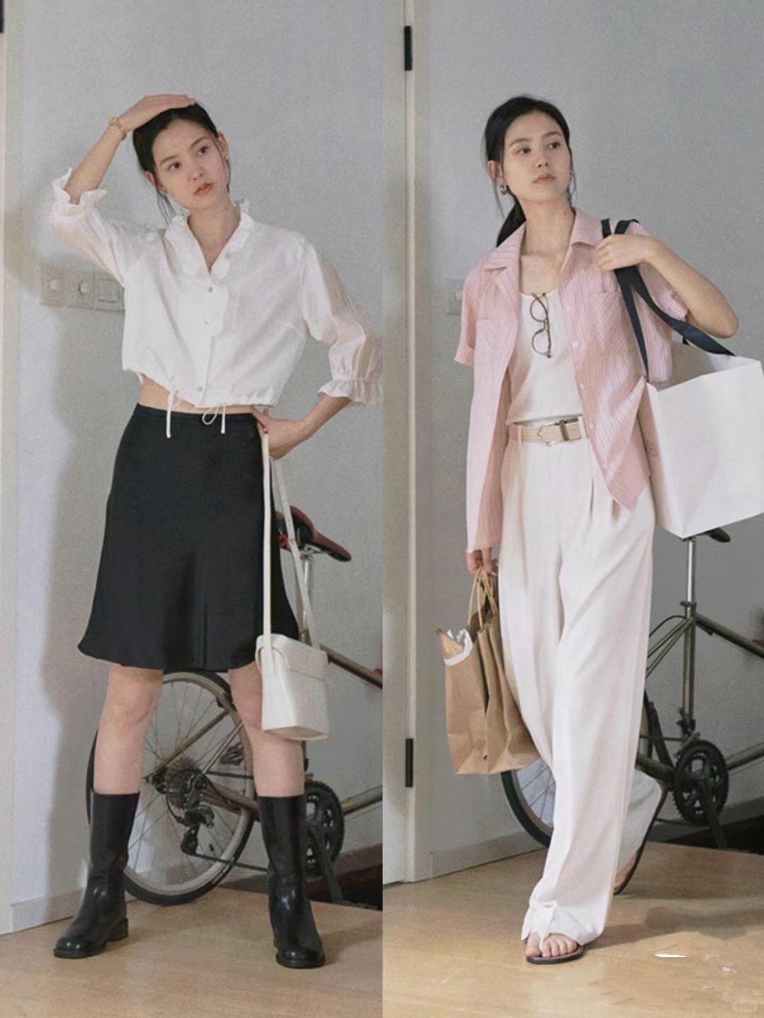 輕薄襯衫+修身吊帶+高腰的闊腿褲