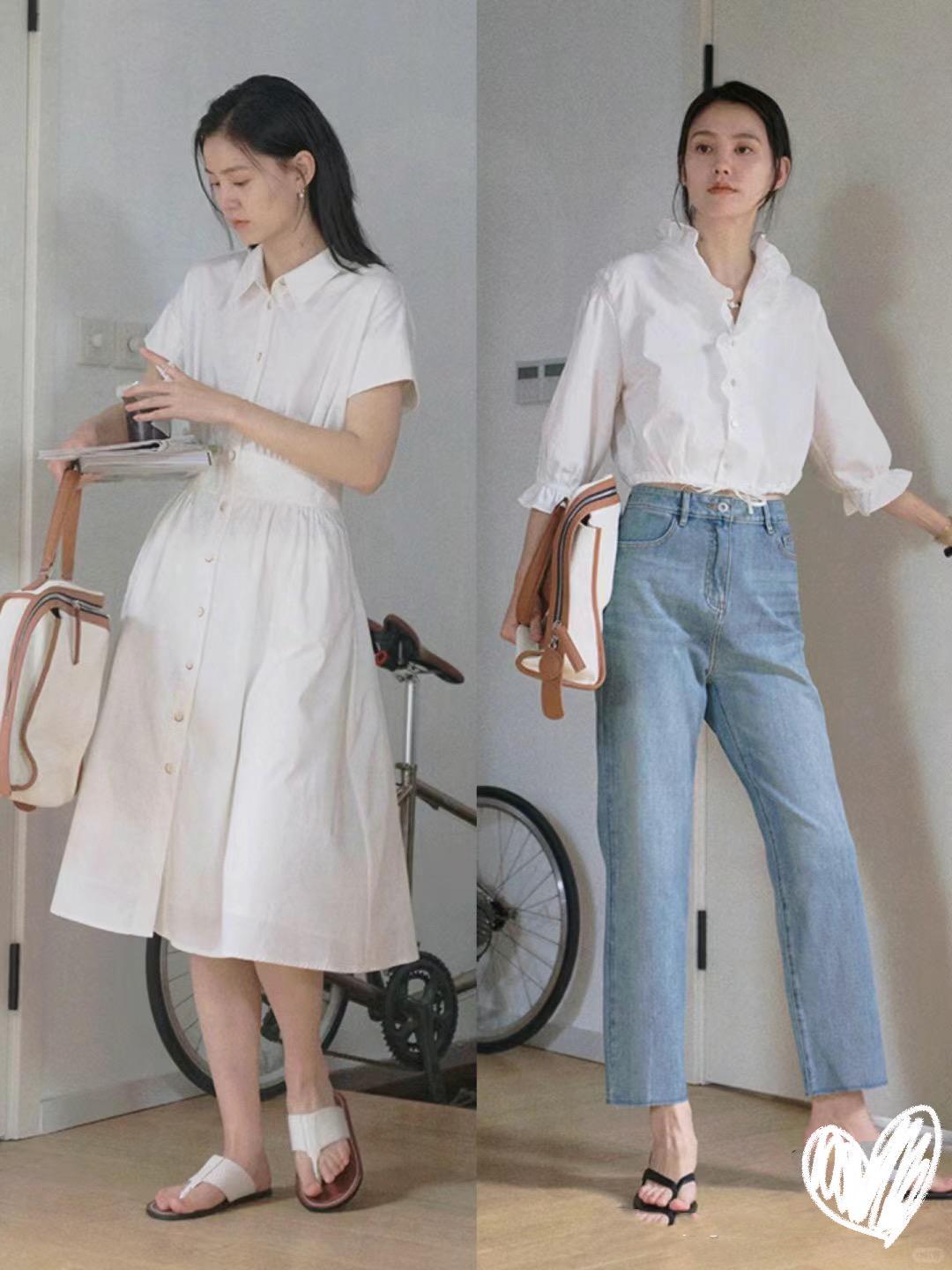 最常見的就是經典的白色襯衫、白色T恤、或者白色連衣裙、以及淺藍色的直筒牛仔褲。這些純色系的單品,自帶清冷大氣之美,容易搭配又很顯氣質。