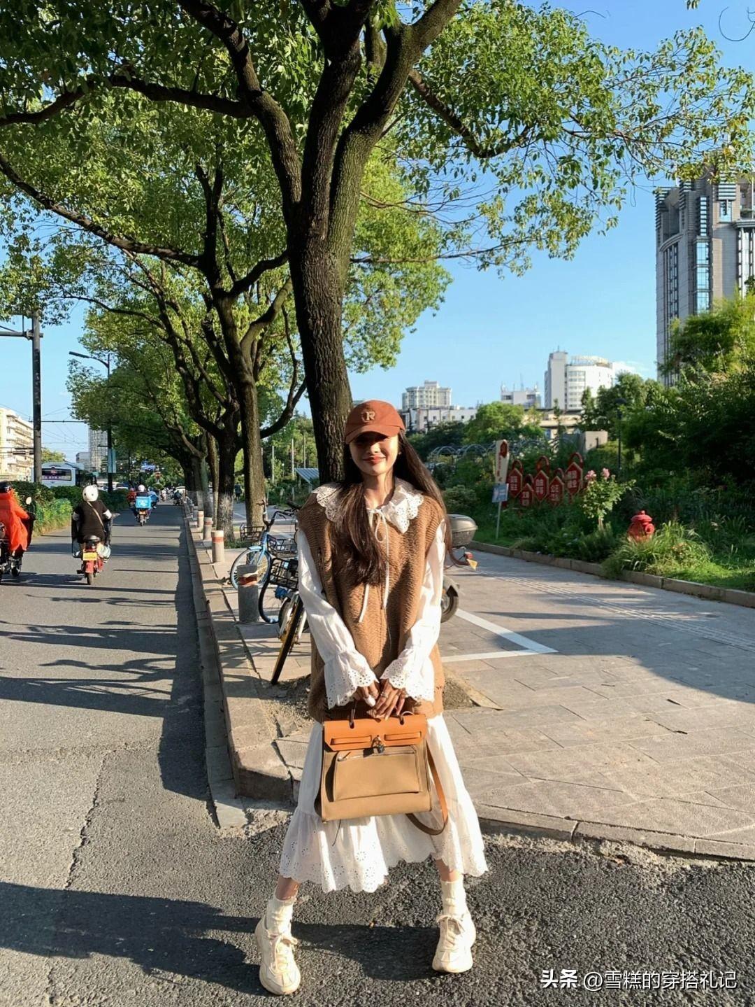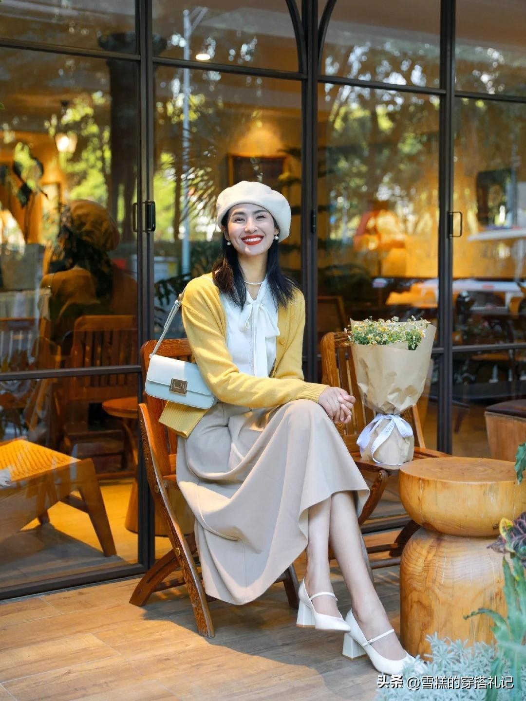 推薦搭配:白色襯衫+米黃色針織衫+奶咖色半身裙