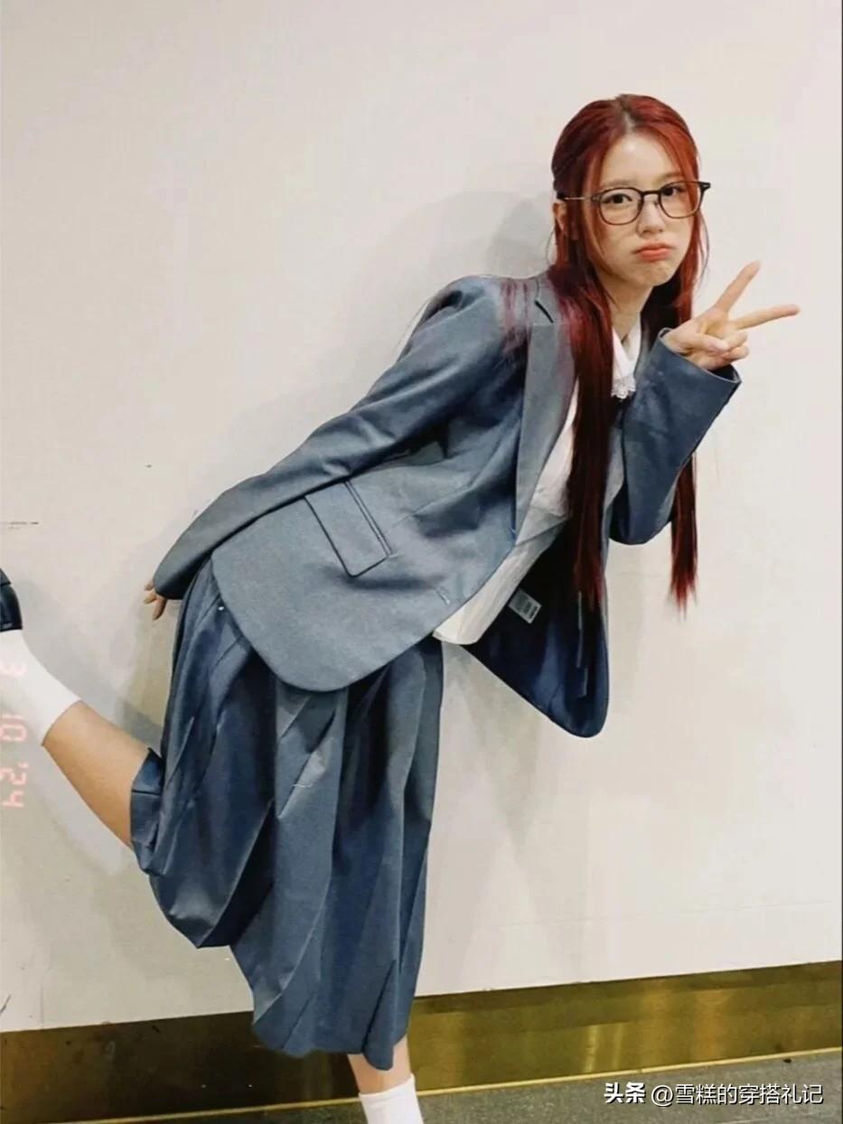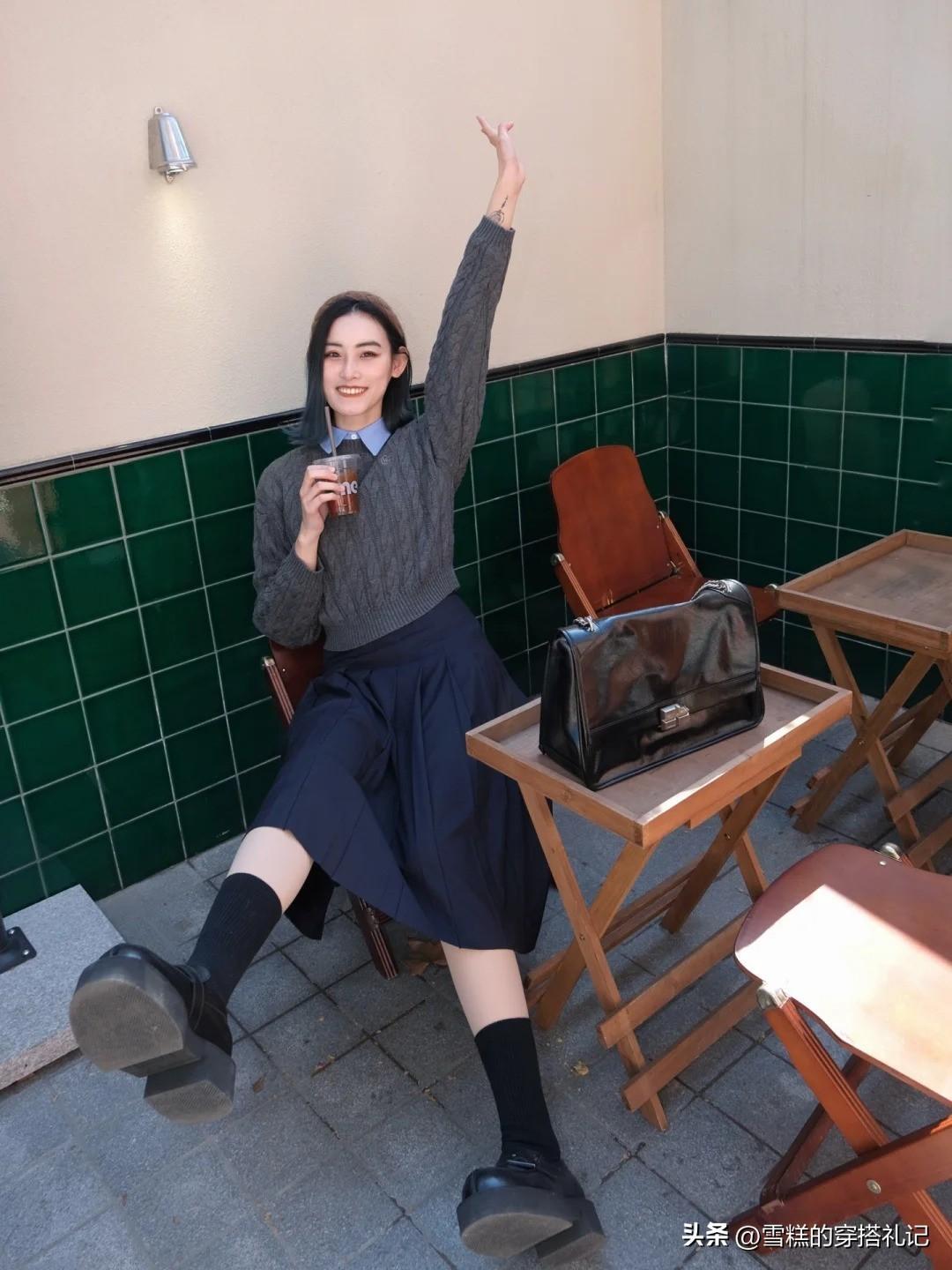 推薦搭配:西裝半身裙+藍色襯衫+深灰短毛衣