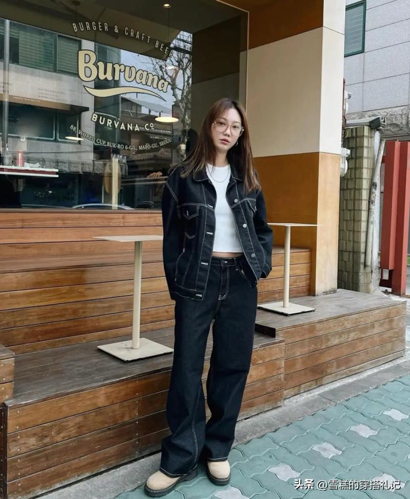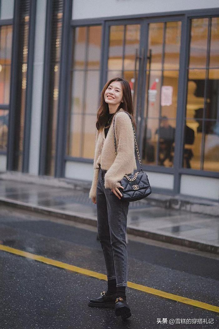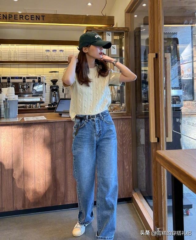直筒闊腿褲的版型是比較垂的,穿上身很顯高,上衣如果也搭配比較立體版型的類型會顯得整個人很筆挺,氣質很利落。開春可以選擇這樣帶着立體麻花紋等設計的毛衣衫穿,本身就自帶定型的立體效果,搭配比較有厚度的牛仔直筒褲,上身效果是很顯高的。