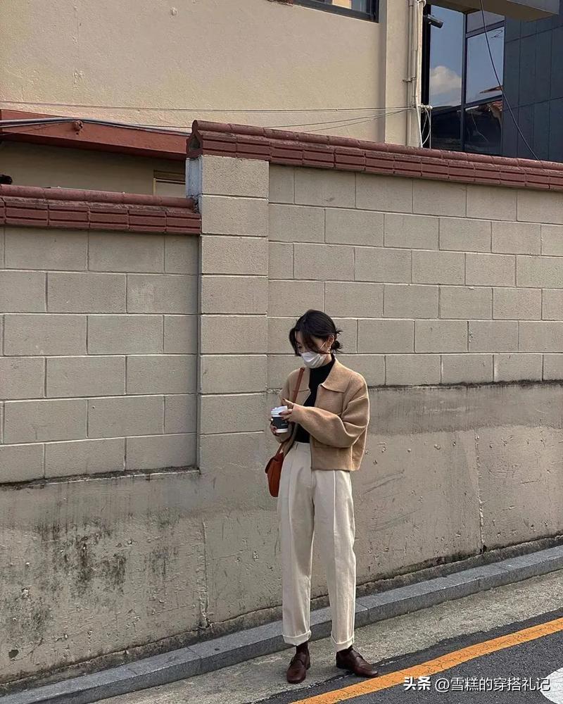 穿淺色的褲子比深色的褲子更具有放大顯高的效果,但是上半身要和下半身平衡,最好選擇深色+疊穿的方式,用顏色的層次感和下半身的淺色進行平衡,這樣整體就會寬度協調,並且也不影響顯高的效果,同時還顯得衣品很好,很時髦。