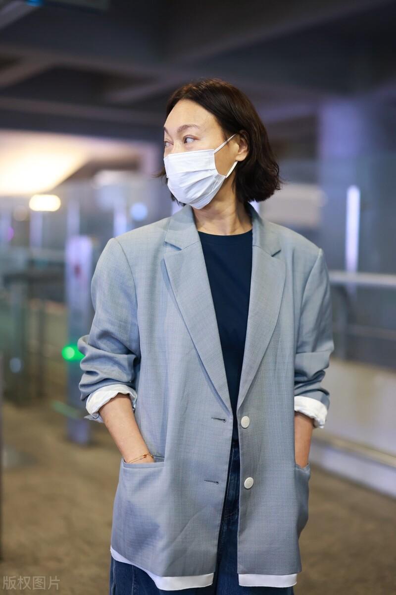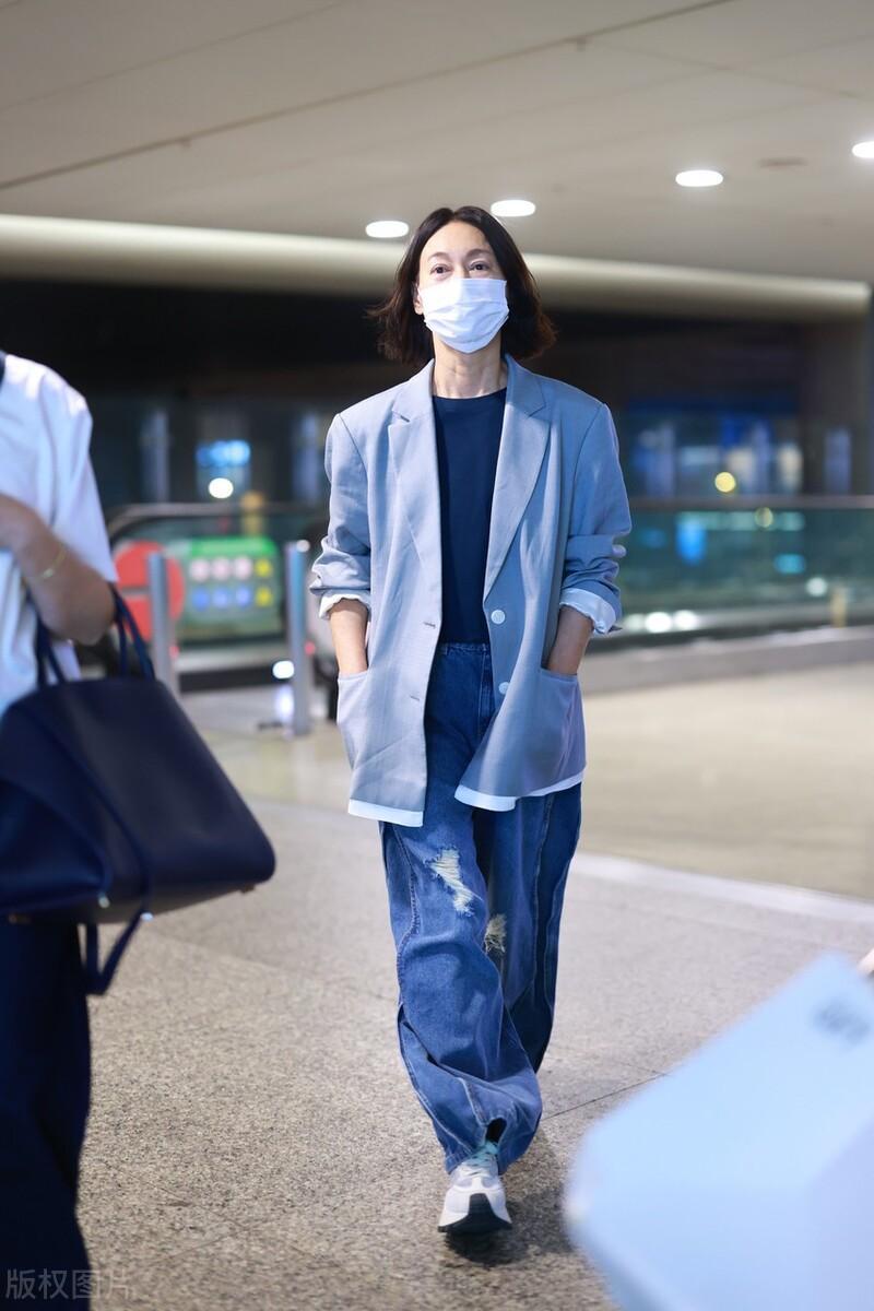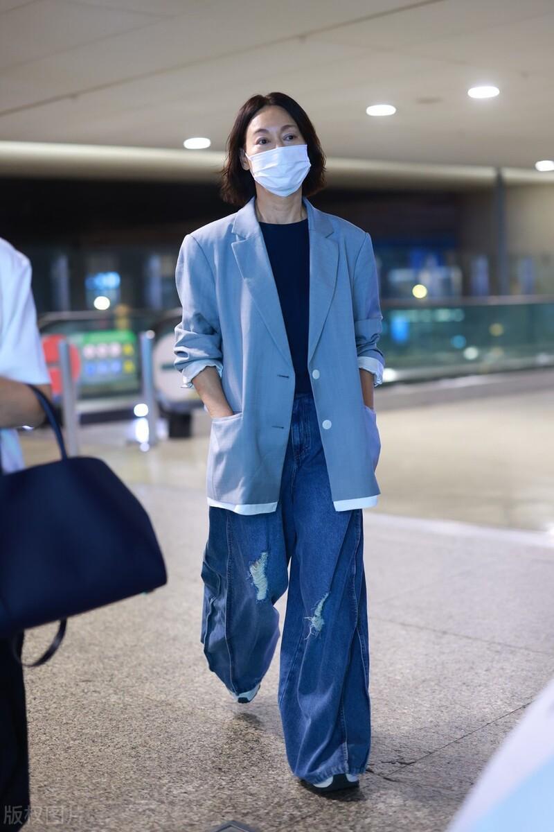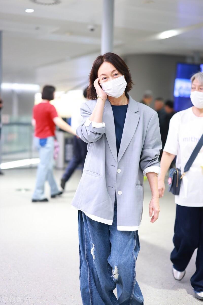 64歲的惠英紅穿一件寬鬆西服走機場,隨性又舒適的造型給人一種淡然大氣的美。寬鬆的西服外套,以大面積的灰色系爲基調、乾淨又大氣。