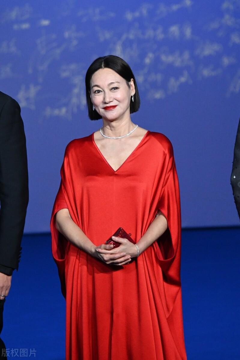 紅色長裙高級豔麗,提氣場又襯膚色。V形的領口搭配上五分袖的設計,小面積的留白更多了鬆弛美,讓惠英紅的穿搭高級又時尚。