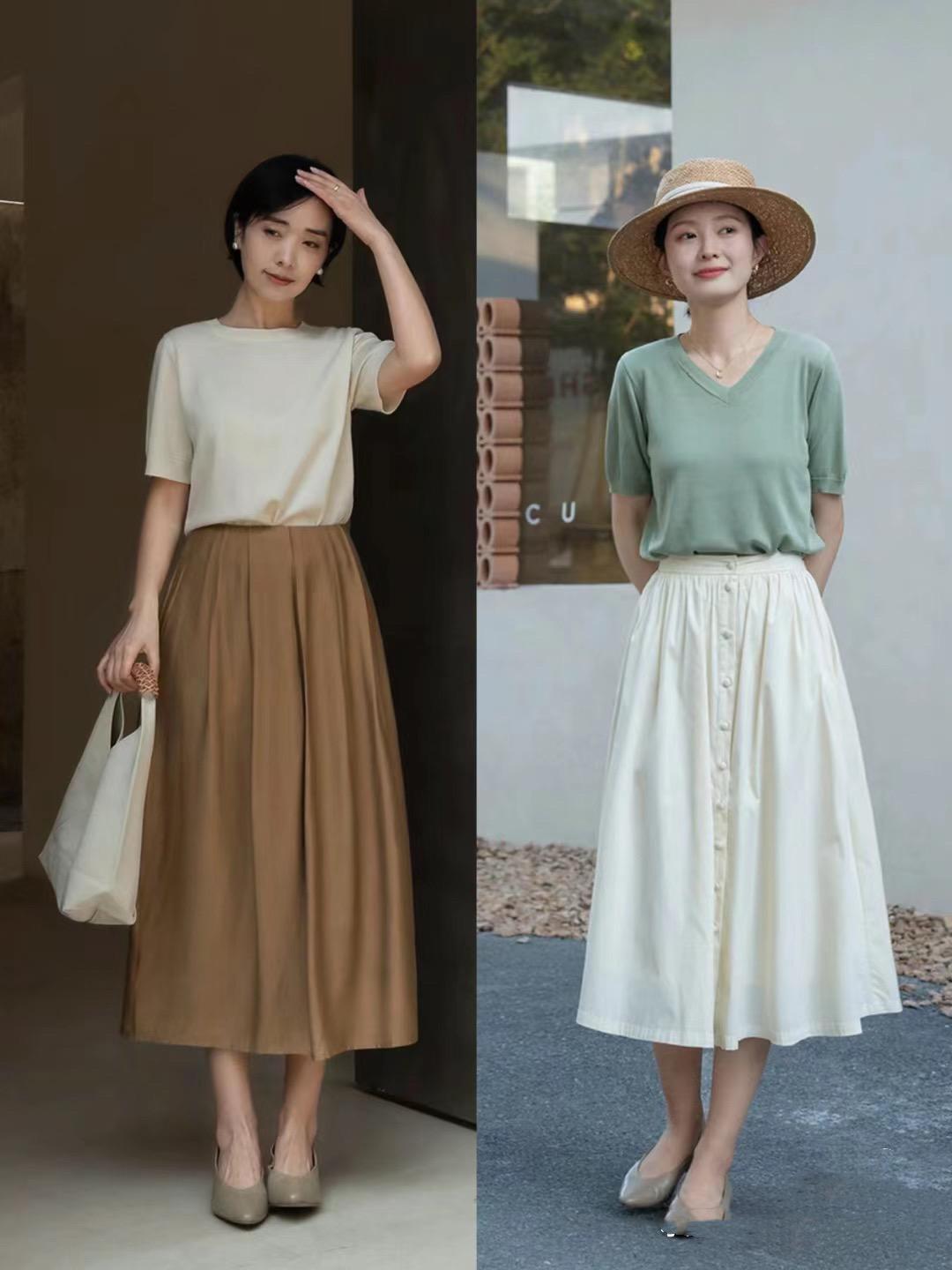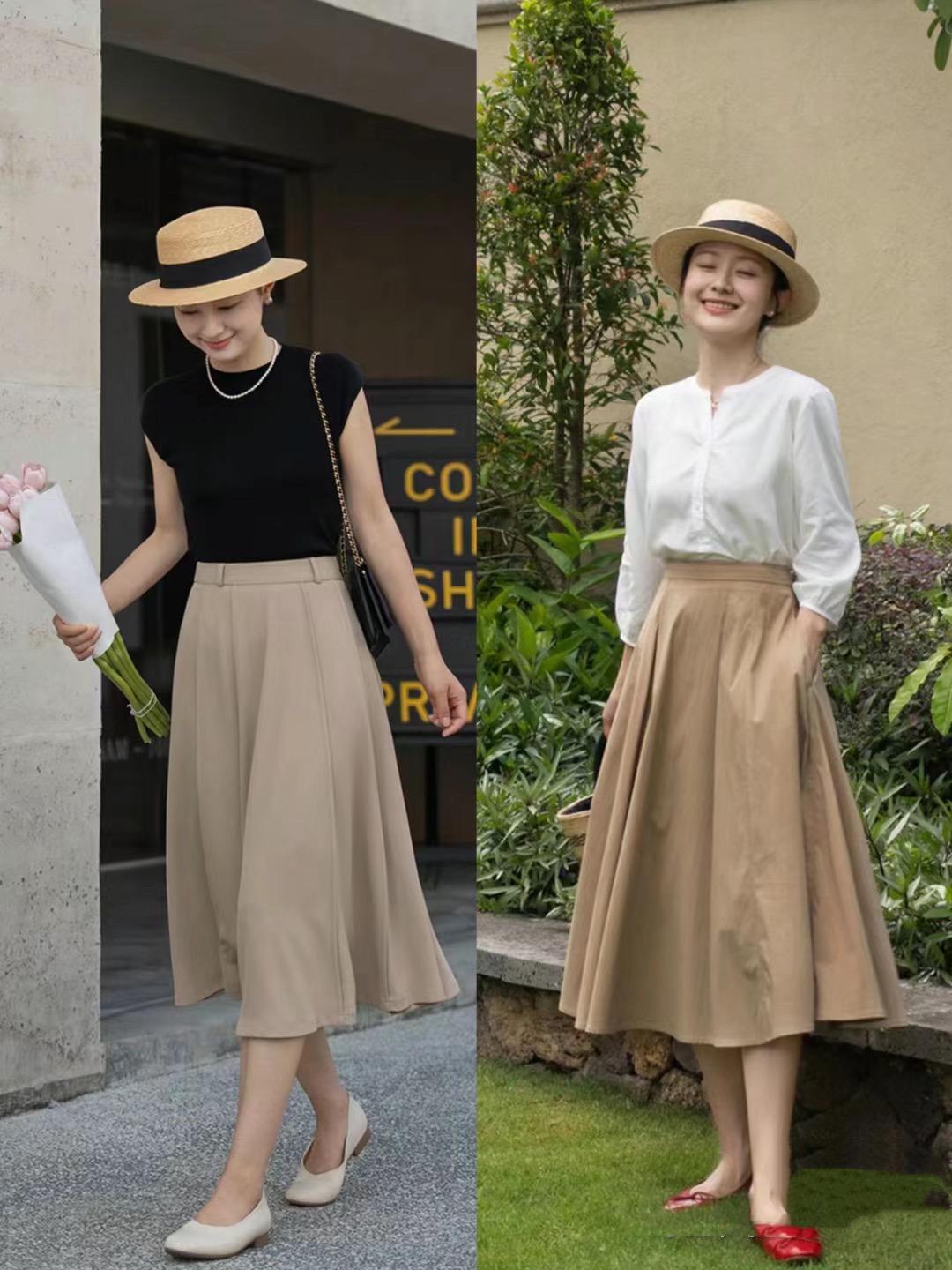 卡其色的傘裙,可以選擇淺卡其或者深卡其的顏色。淺卡其色的半身裙,更加溫柔甜美。深卡其色的半身裙,更加高級低調,配淺口單鞋,都輕便舒適。