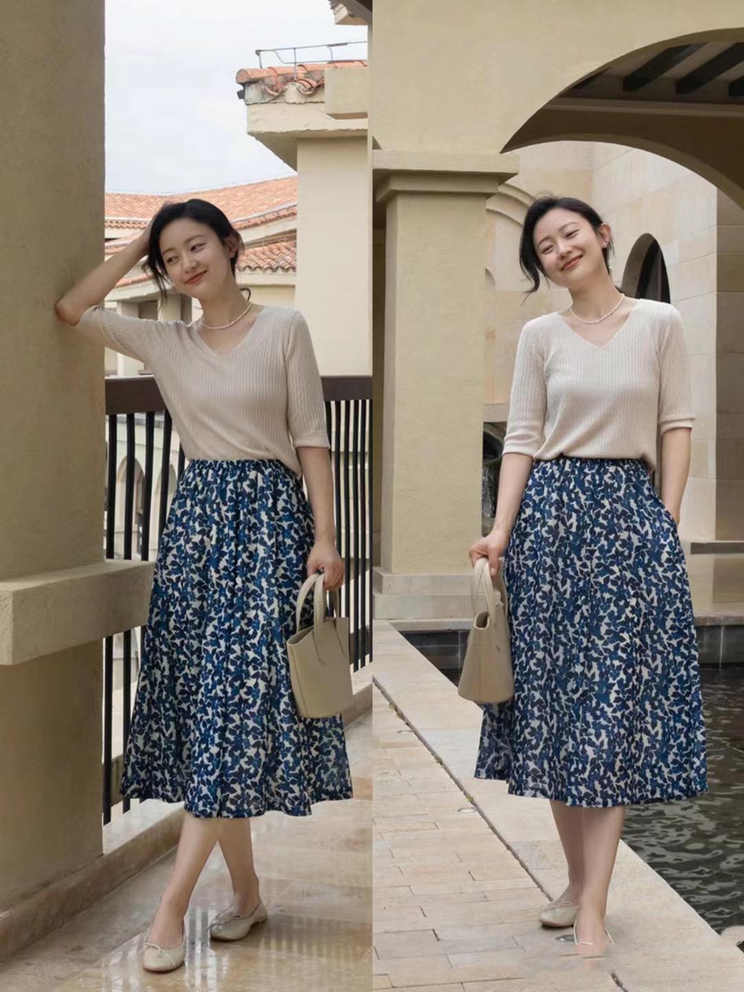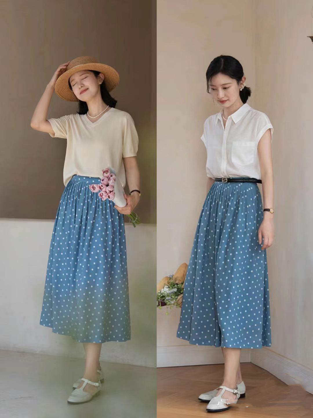 比如清爽耐看的波點半身裙,就是比較簡潔大方的奶奶裙。藍底白花的奶奶裙,溫柔陷阱又不挑人。用奶奶裙搭配寬鬆的襯衫、或者T恤,舒適又自在。