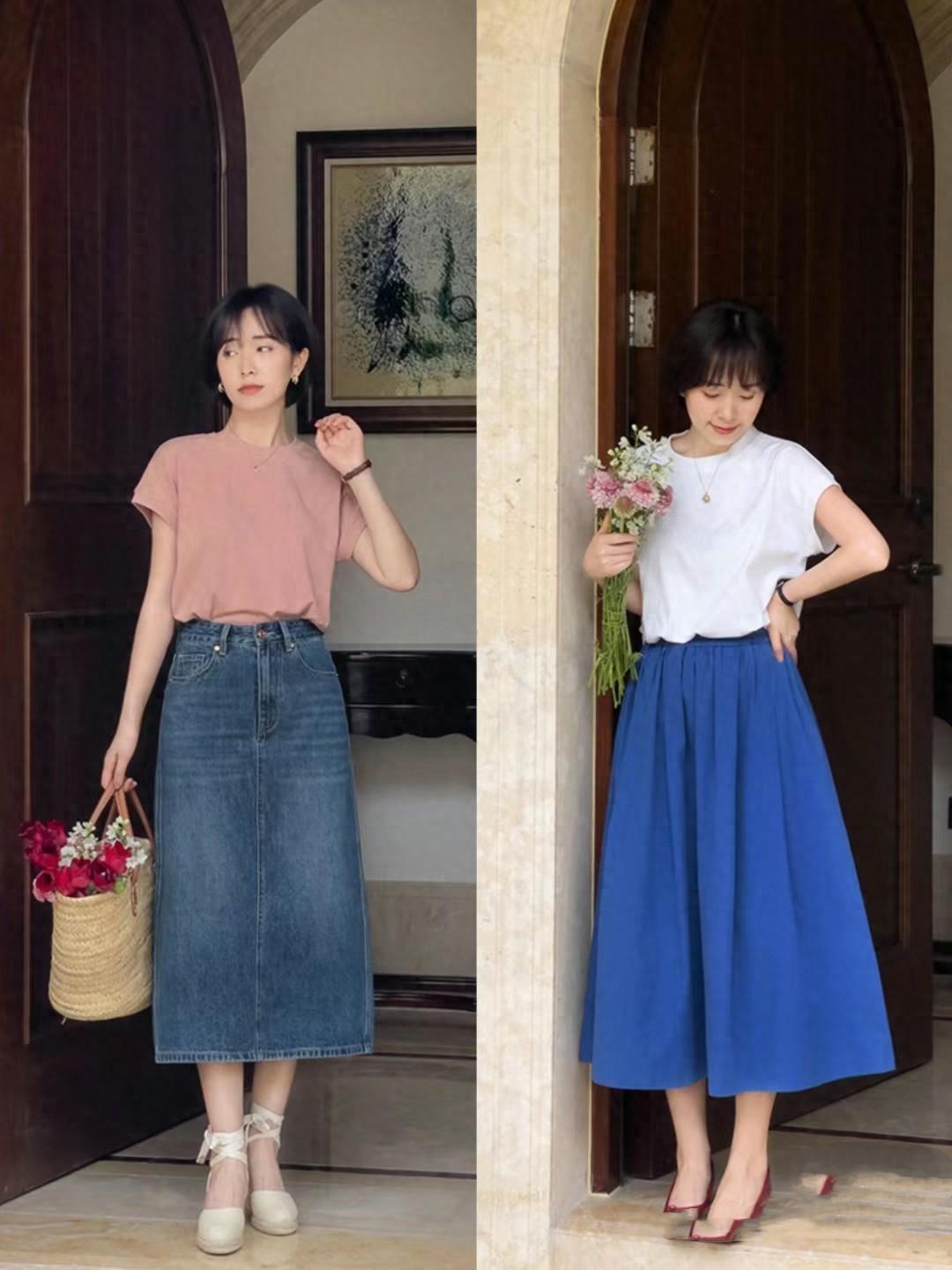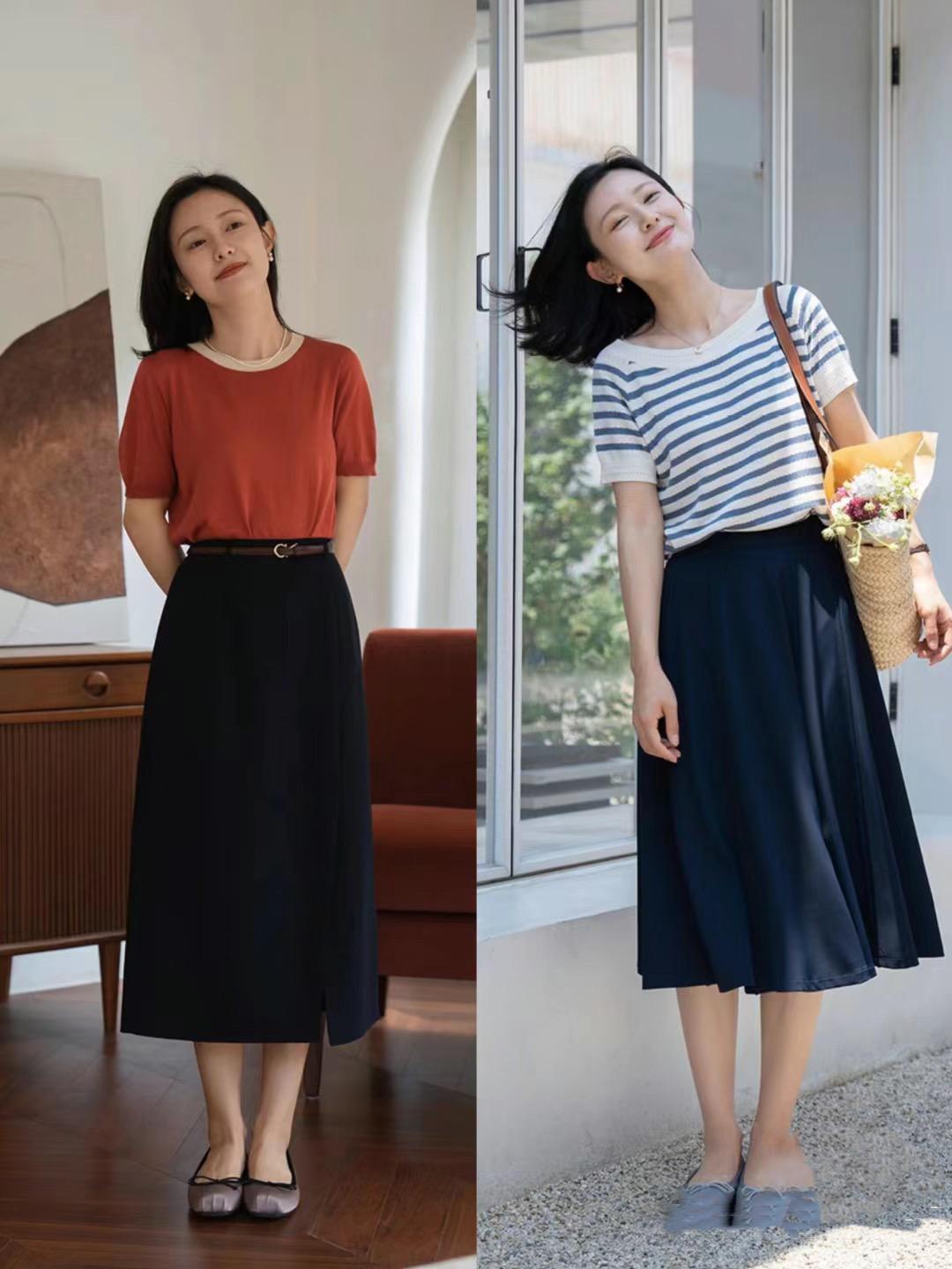 高腰的半身裙,配上柔軟細膩的雪紡或者桑蠶絲面料,更加垂墜大方。稍微大量感的設計,讓半身裙具備了更強的包容性。配藍白條紋的T恤,清爽又減齡。