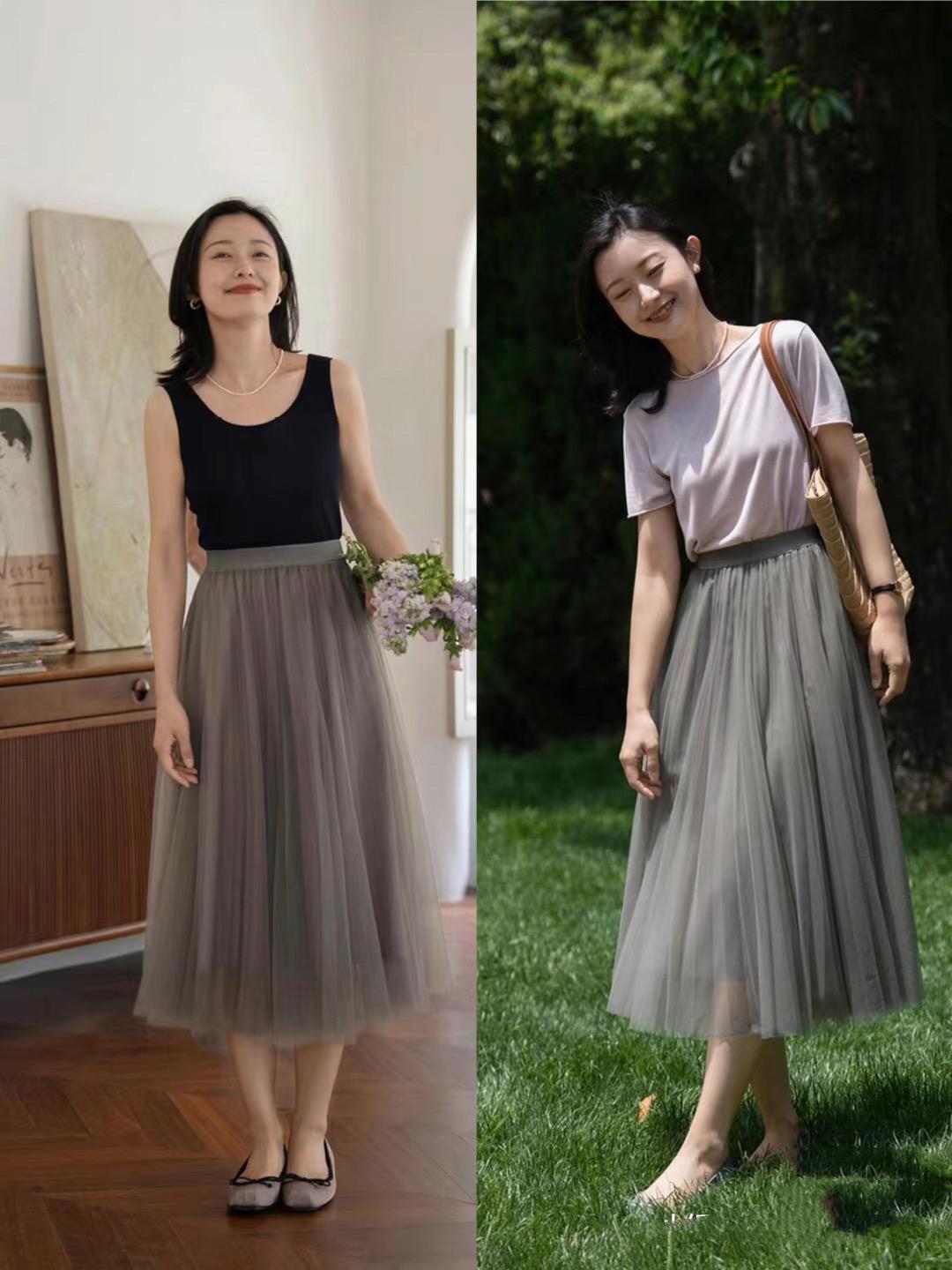 奶奶裙不光不挑人,對於身材的修飾性也會更強一些。像這種高腰的奶奶裙,我們可以配薄紗的質地,輕柔浪漫且減齡。