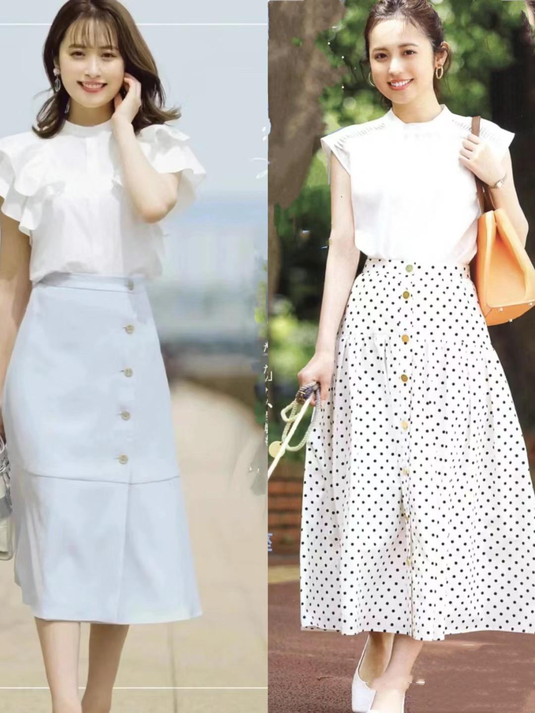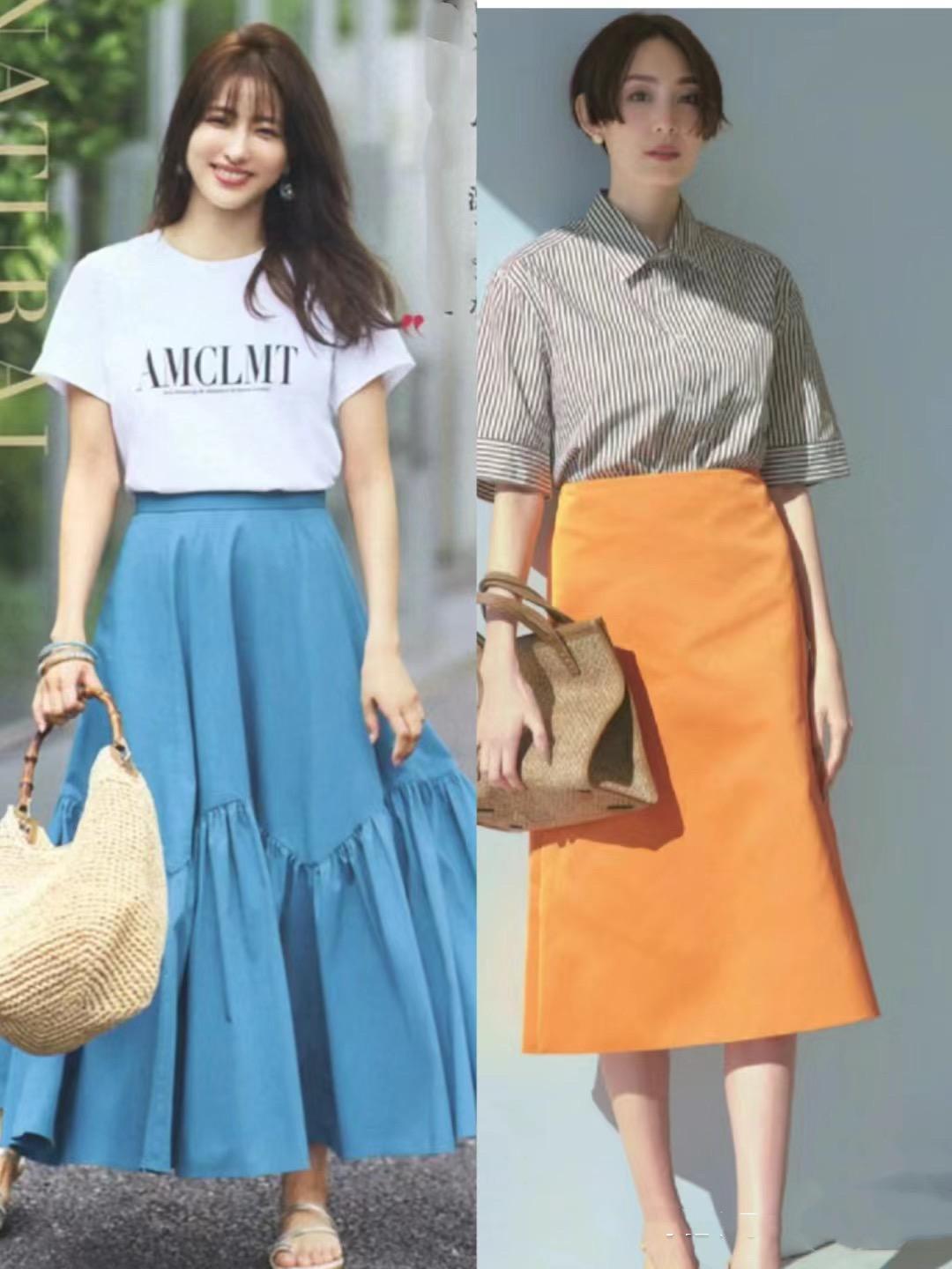 我們可以將襯衫或者T恤的下襬塞進半身裙的裙腰裏,不僅抬高了腰線、也優化了比例。簡單的半身裙,可以配A字形的剪裁,修飾下身厚重、更加百搭顯瘦。