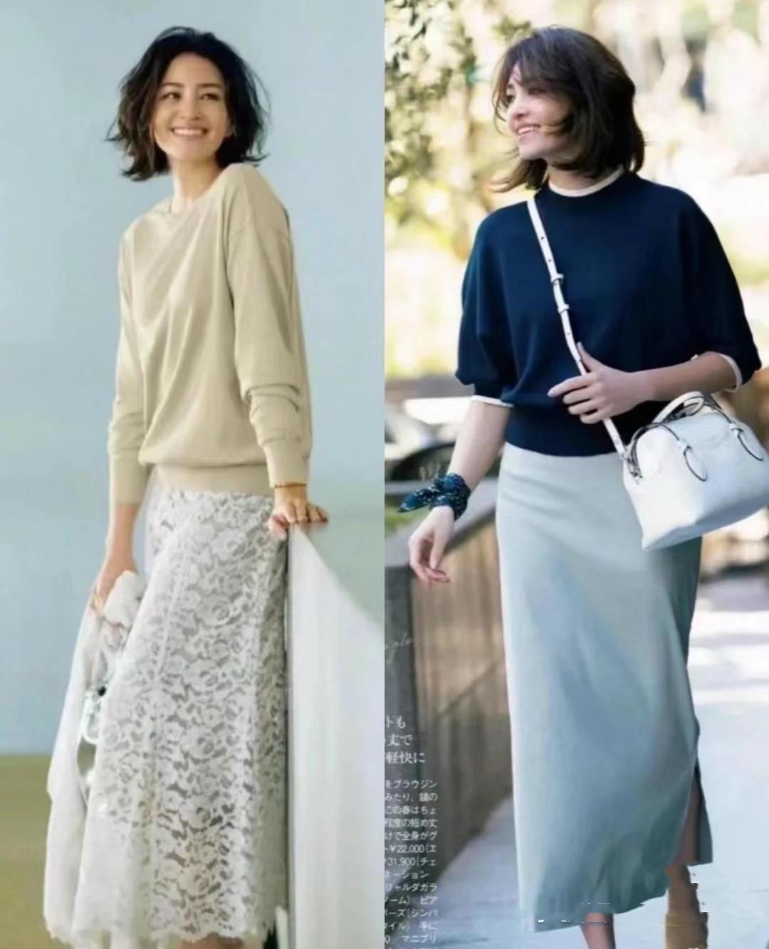 五官顯得立體年輕了,即便是穿基礎款的打底衫也很優雅。用基礎款打底衫可以配高腰的直筒半身裙、或者蕾絲半身裙。H型半身裙配開叉的剪裁,溫柔體面還顯貴。