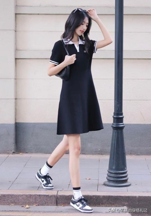 如果想要穿出減齡感的穿搭,那麼可以選擇具有校園風元素的裙裝。POLO衫設計的連衣短裙就是不錯的選擇,不僅對身材沒有束縛,穿起來十分舒適,而且又很日常顯活力。黑色的短裙結合黑白拼色的板鞋,舒適感明顯,並且配色統一協調,更加大氣。