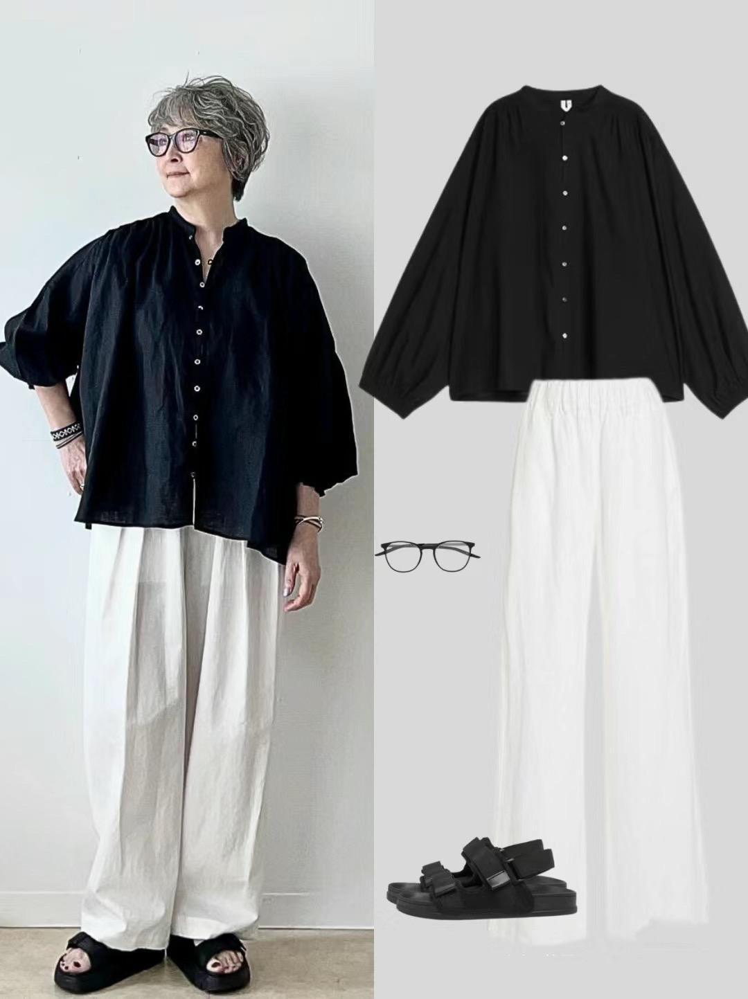 寬鬆一點的黑色襯衫,落肩+七分袖的設計,對於60+女性的身材包容性更強。白色系的小紐扣,打破乏味提升了精緻感。