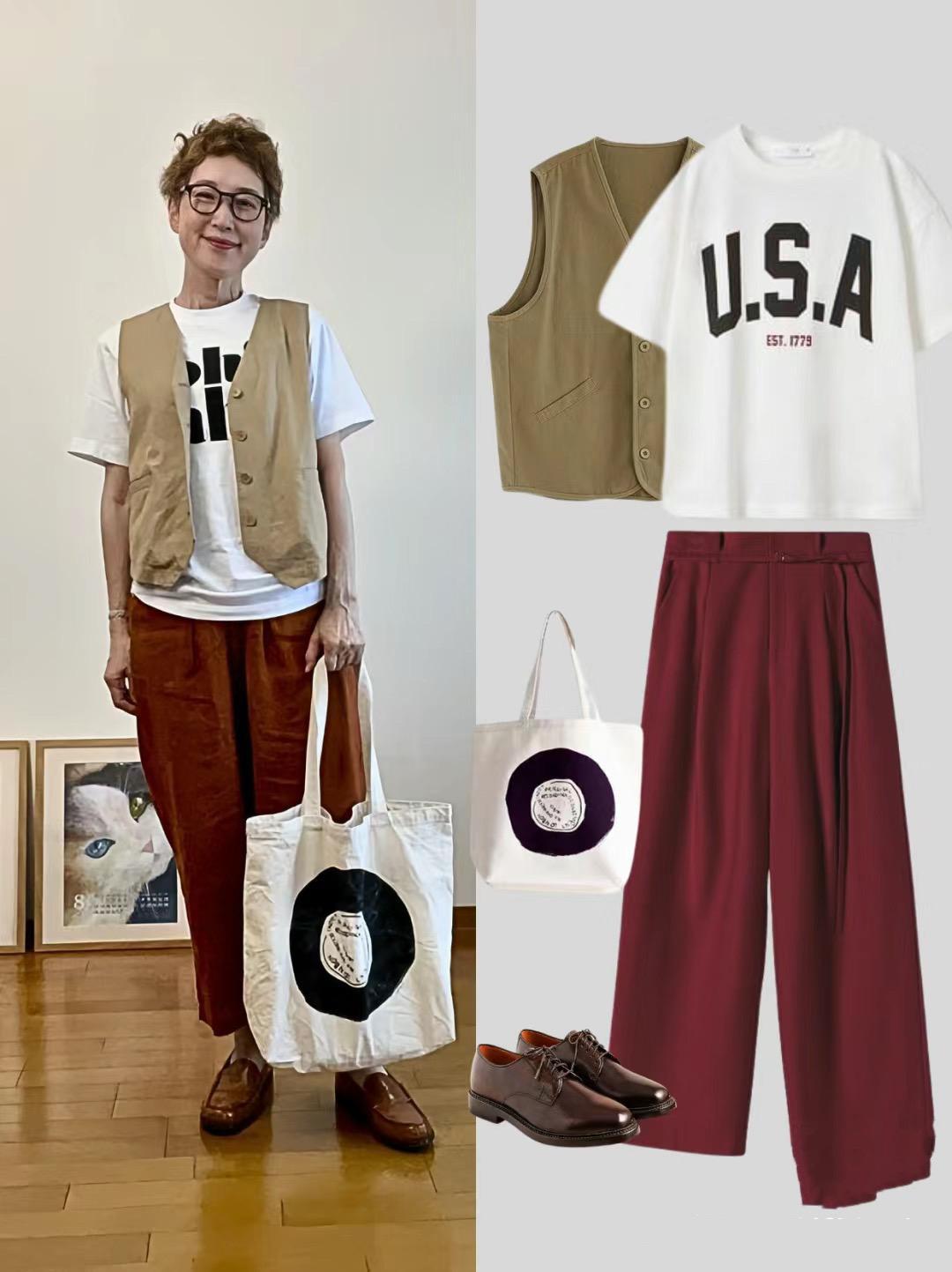 這樣的搭配,帶着文藝復古範。白色字母印花T恤的休閒風,弱化了歲月的沉重感,即便是搭配酒紅色九分褲、棕色皮鞋,也沒有那麼中規中矩。白色字母印花T恤,是弱化年齡感的關鍵。