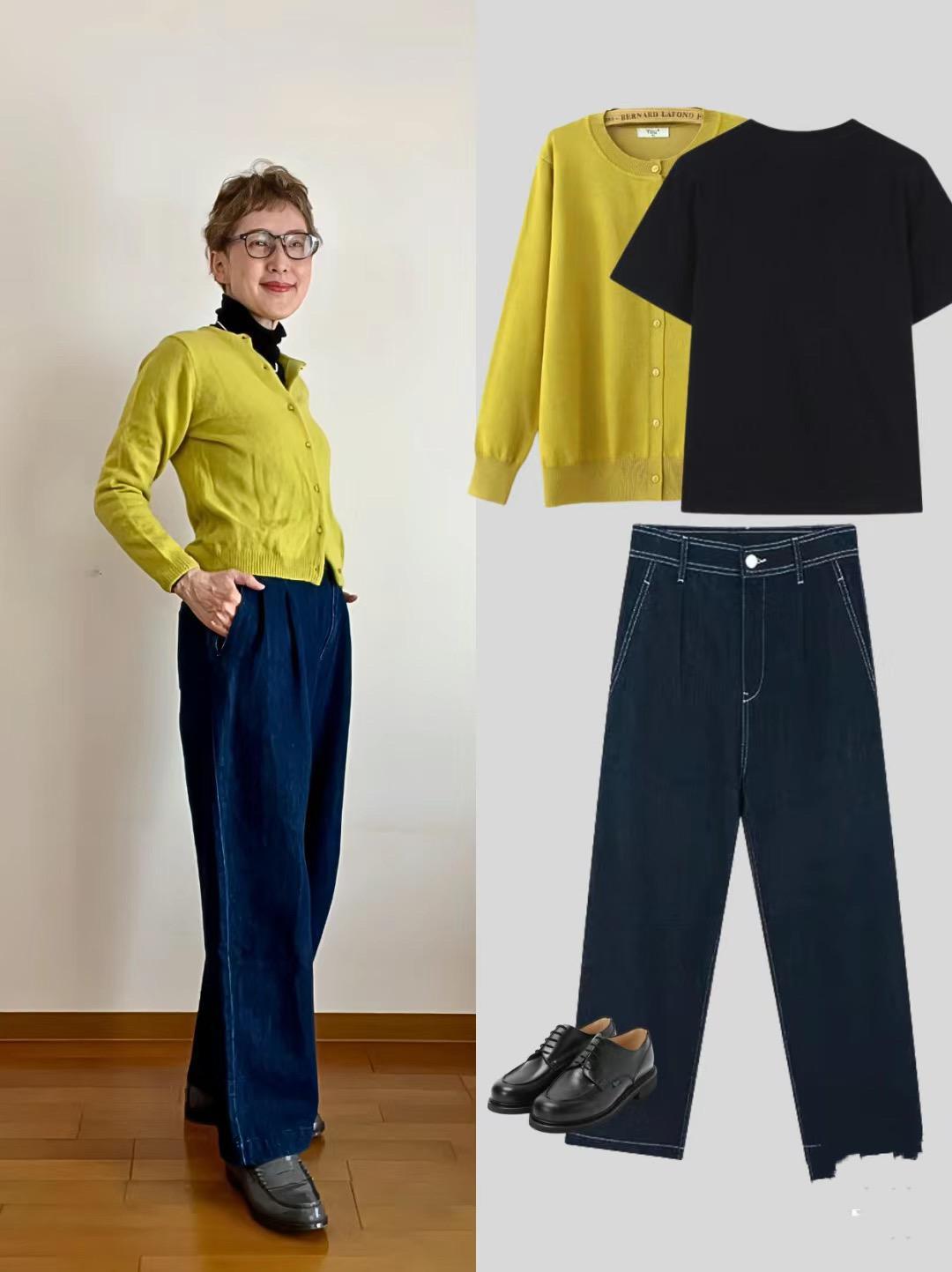 檸檬黃的針織衫,疊搭黑色T恤,高級又顯瘦、黑色T恤作爲內搭,酷颯顯瘦還很舒適。像這種黑色T恤,也是不挑人的單品,配直筒牛仔褲也格外洋氣。
