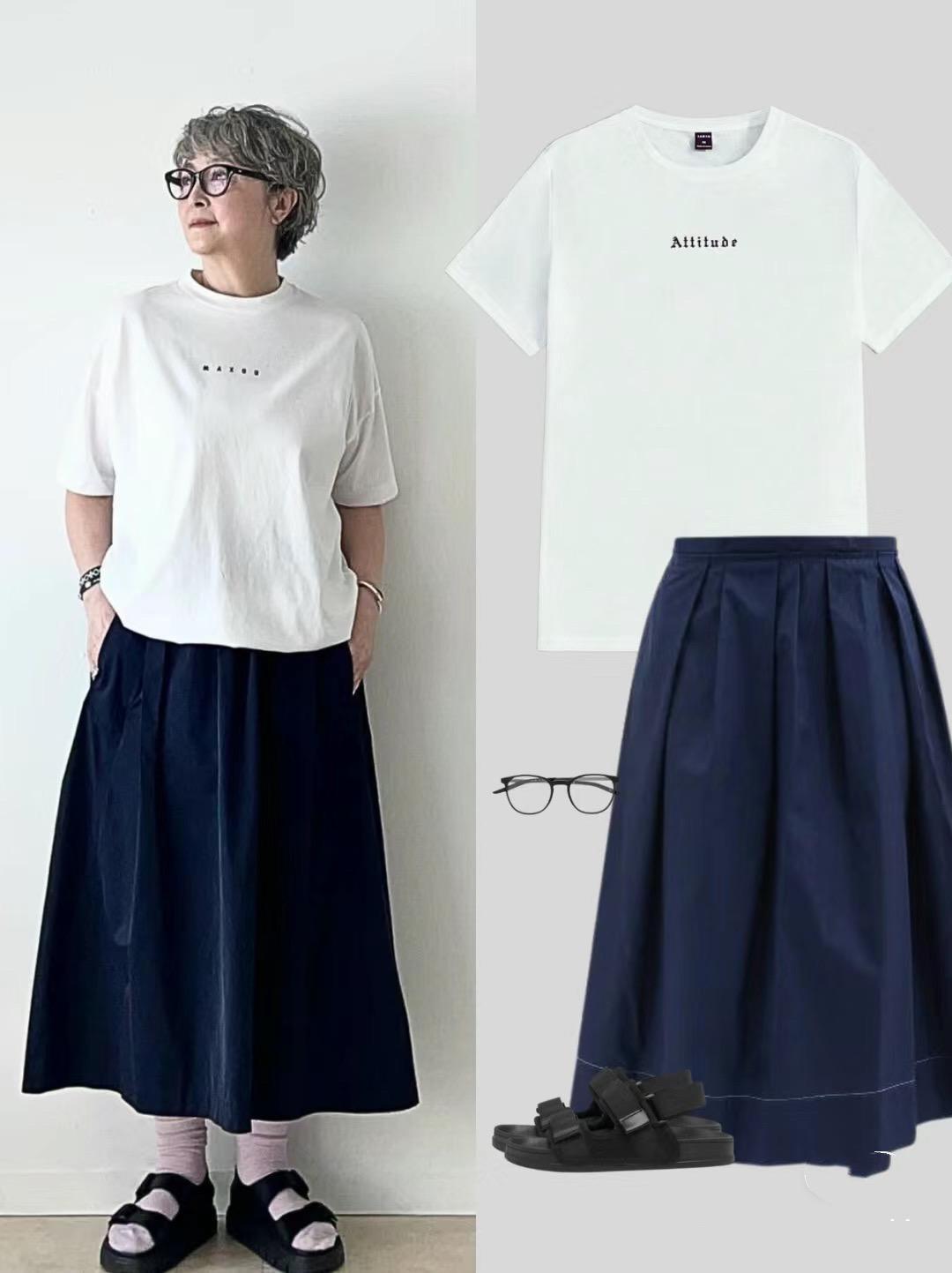 白色T恤可以配高腰的藏藍色半身裙,簡約大氣又具備了包容性。不得不說藍白配色、也是乾淨體面的。白色T恤的穿搭,在60+女人身上也如此出彩。