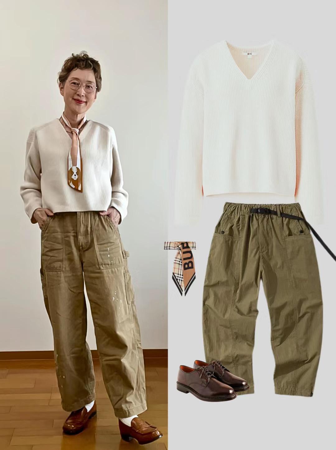 看似簡潔的白色V領針織衫,只需要疊搭小絲巾的修飾,就表現出女性的風情。60+的奶奶,依然喜歡優雅浪漫,喜歡絲巾帶來的唯美與氛圍。