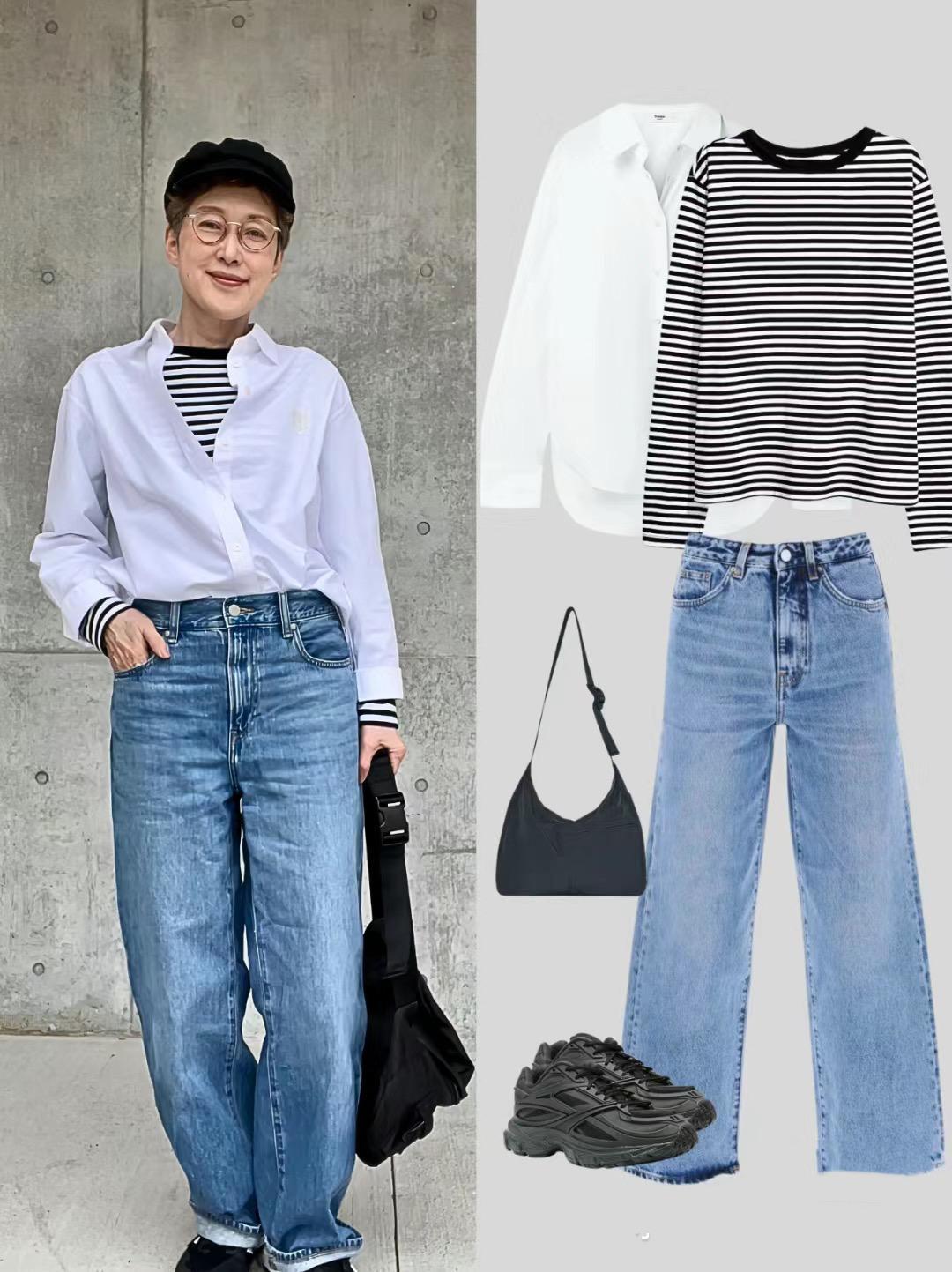 黑白條紋的T恤,疊搭基礎款白襯衫,有一種清冷高級的美。白襯衫+條紋T恤,帶着文藝範又很減齡。隨意搭配高腰的直筒牛仔褲,簡潔清爽。