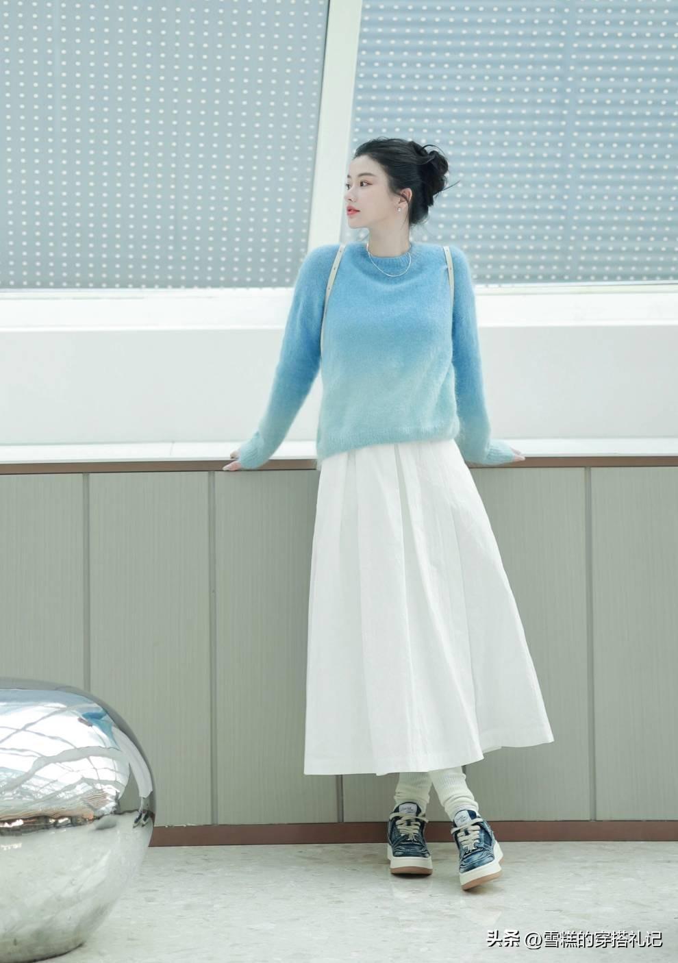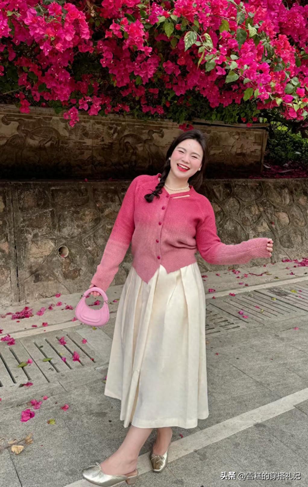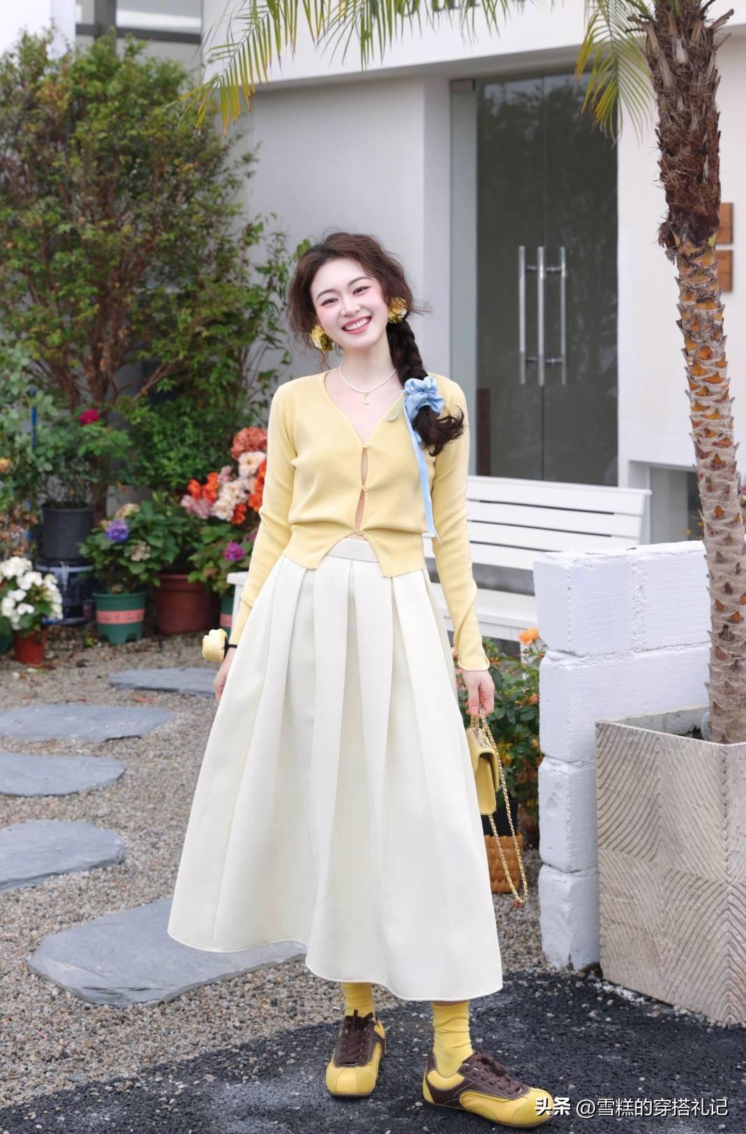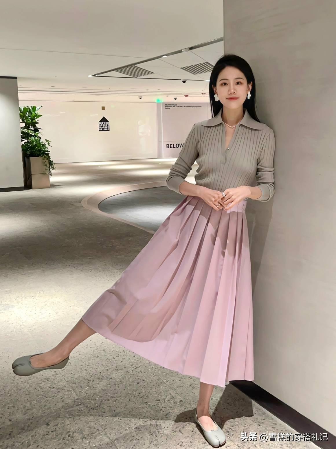 像這種面料柔軟,並且很有彈性的針織衫,通過polo領的設計,就可以增添露膚面積,從而轉移視覺重心。再搭配上一條高腰款式的百褶半身裙,寬闊的裙襬,又爲我們的身材多了一份保障。