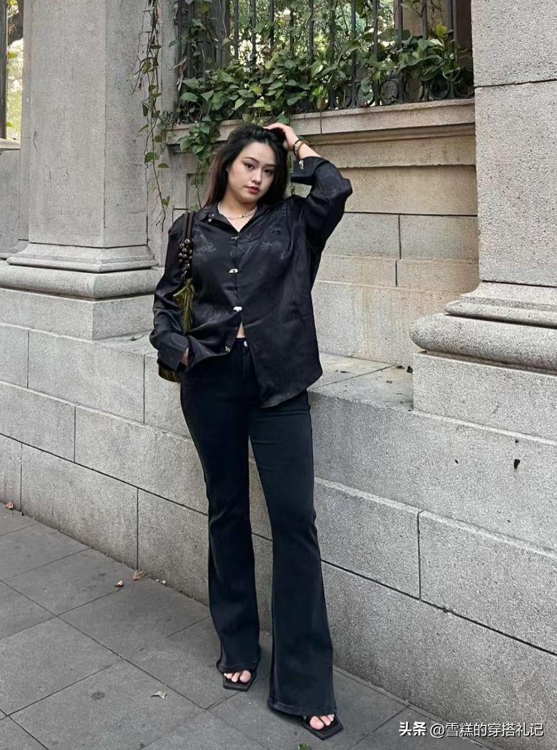 近兩年,新中式風可以說是最受歡迎的穿衣風格,特別是對於微胖型身材的女性而言,優勢力度更高。微寬鬆版型的新中式襯衫,古典高雅又特別遮肉,跟修飾腰臀曲線的微喇褲進行組合,別提多顯身材了。
