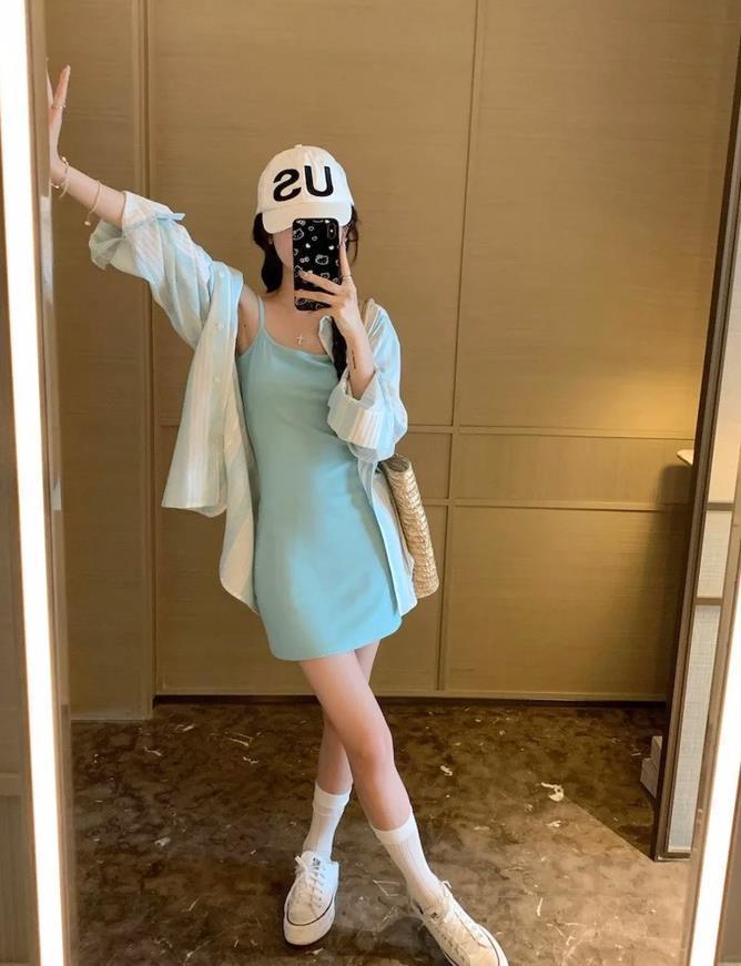 適合五一出遊的穿搭來了,這一身薄荷綠色也太清爽乾淨了吧?這是屬於夏天的薄荷曼波,一整套的看起來也超讚的,條紋襯衫+薄荷綠吊帶連衣裙,整體給人十分清新的感覺,不僅顯白還很防曬。