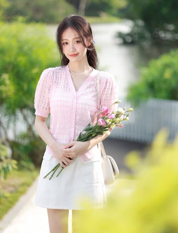 在夏天也是可以穿針織的,像這種透氣性極佳又清爽涼快的薄針織開衫,加上淡淡的粉色,也太顯嫩了吧,鏤空的設計,精緻又舒適,日常出現也不會覺得悶熱,簡單搭配一條牛仔半裙,就非常顯氣質又溫柔了。