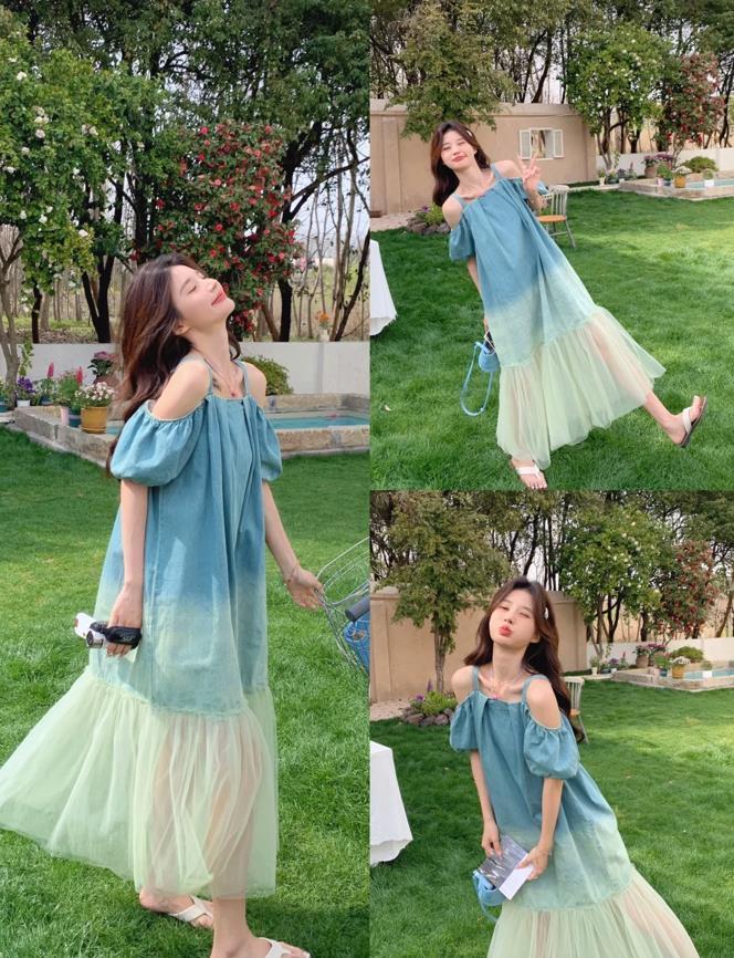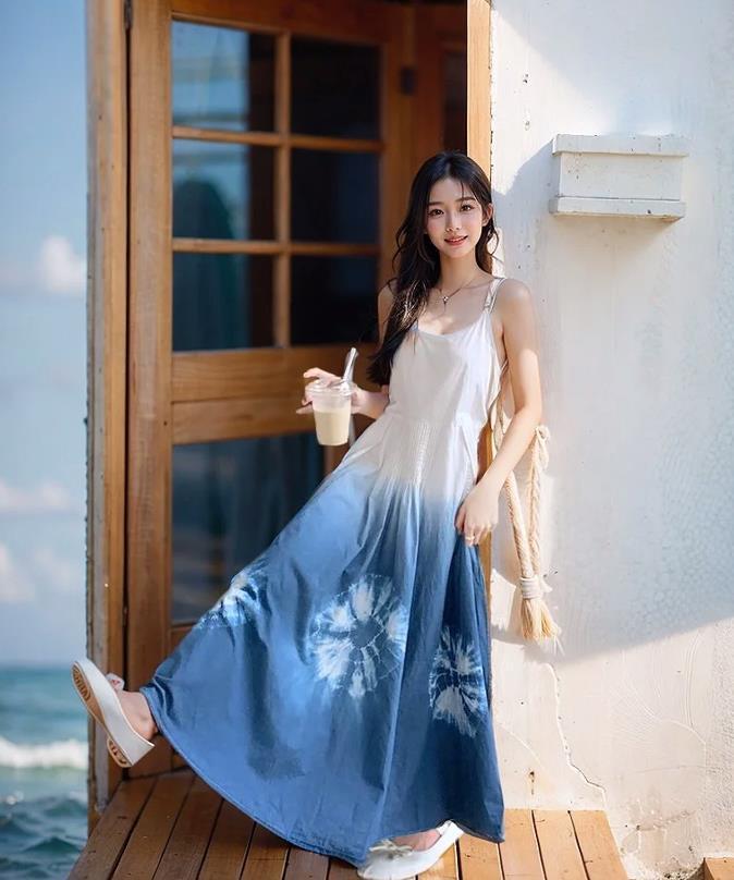 在五一假期,說什麼也要趁着空閒時期出門遊玩一番,這一條丁達爾漸變吊帶連衣長裙,拍照出片率超高的,裙襬是扎染漸變的效果,個性又美。