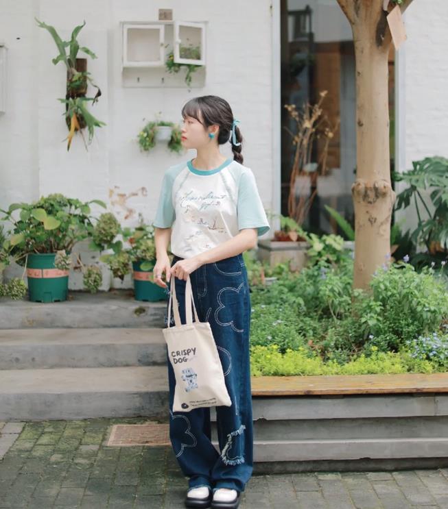 漸變水洗牛仔藍色,真的好好看啊,前排扣設計,穿脫十分方便,內搭簡單白色t恤,就超級減齡的,搭配一雙運動鞋後,青春又不失活力感。