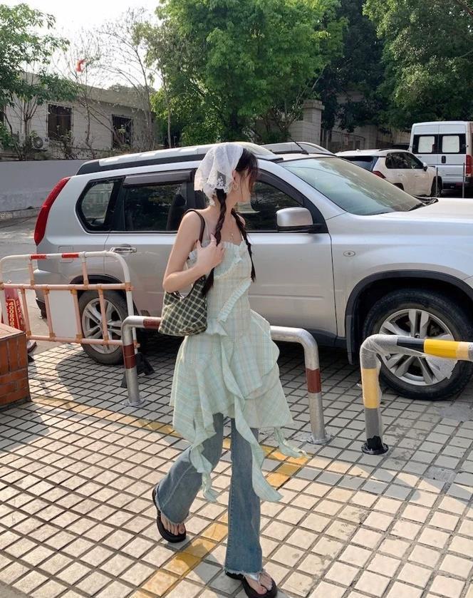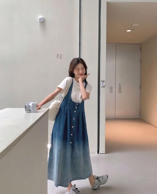 不規則吊帶裙,疊穿牛仔褲,好有韓系氛圍的既視感,出門逛街約會都會輕鬆成爲焦點。