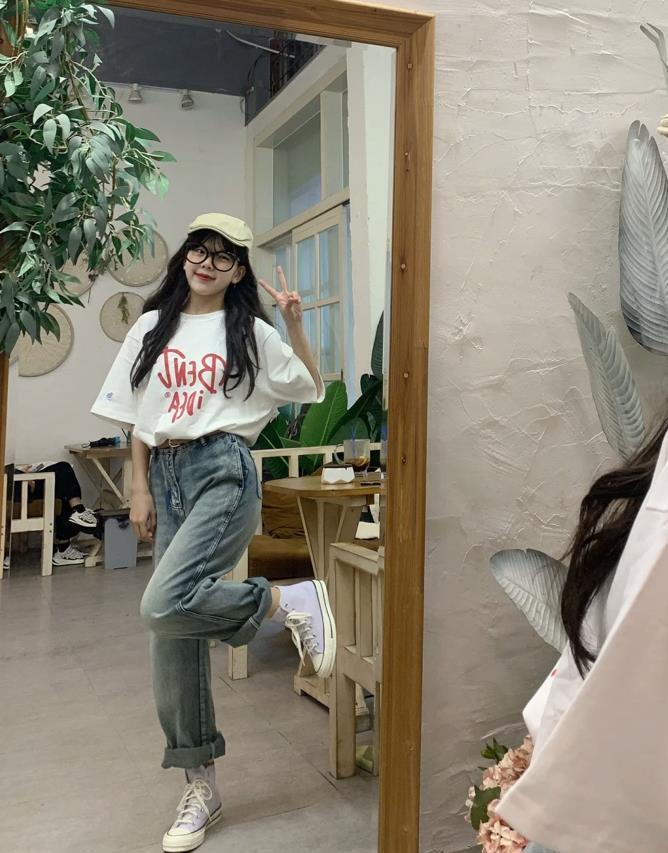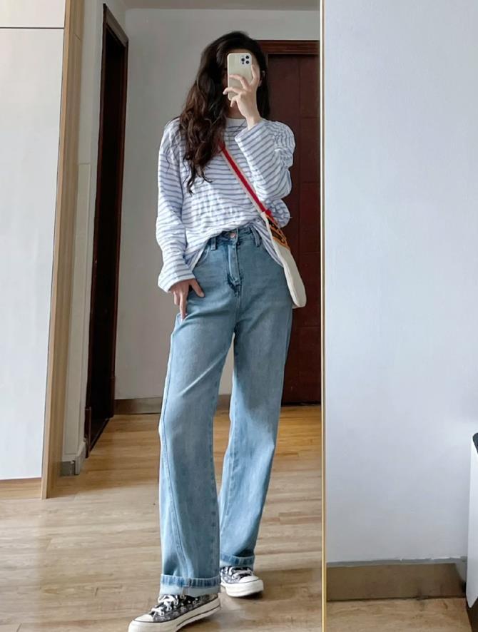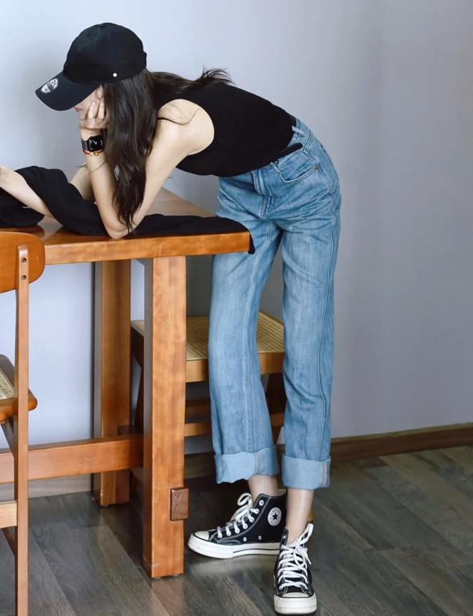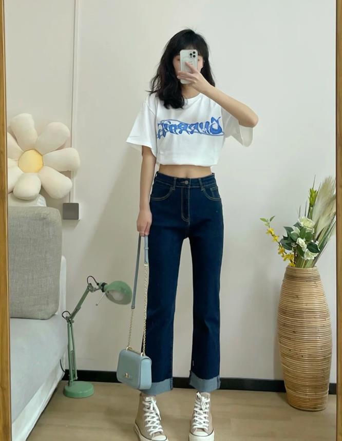 牛仔直筒褲穿起來是真的非常顯腿直,淺色卷邊直筒褲,長度到腳踝的位置,拉長腿部線條,又能很好修飾腿部比例。搭配一件簡約的t恤,白色很百搭,胸前的印花配色也很好看。