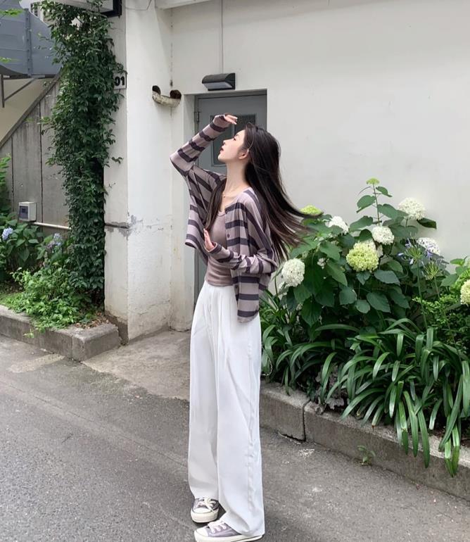 韓裏韓氣的一套,沒有想到灰咖條紋衫居然這麼好看,是兩件套的,舒適透氣的材質,在夏天裏穿起來,不僅防曬,還很清爽。搭配白色拖地褲,加上帆布鞋,這樣的搭配很顯瘦舒適。