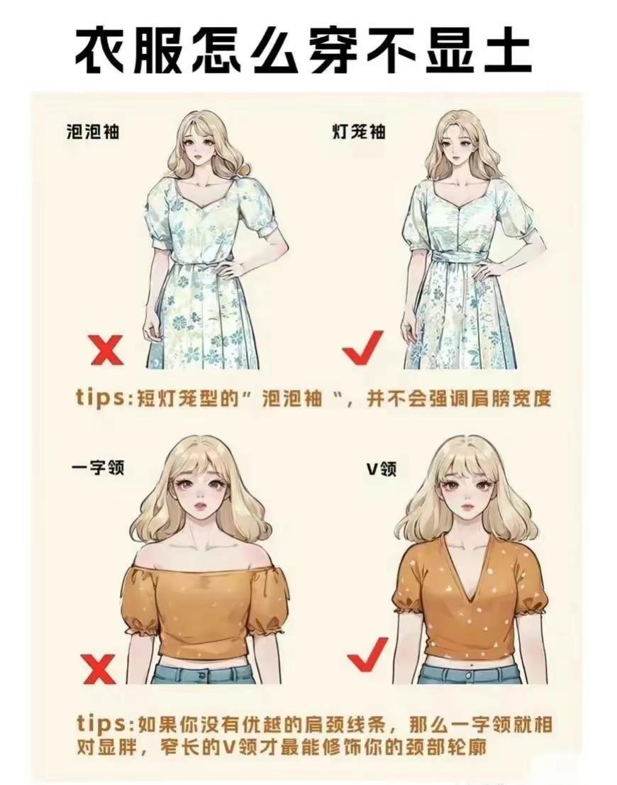 我們可以選擇短燈籠袖的連衣裙,或者V領的上衣。V領的襯衫、或者T恤、小衫穿起來都能修飾肩頸線。除了V領還可以選擇方領+V領的連衣裙,優雅又輕盈。