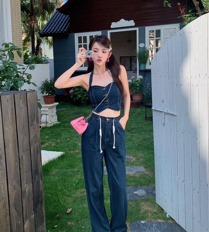 美式復古風的牛仔套裝,它是由吊帶+闊腿牛仔褲組成的,掛脖式的吊帶設計,自帶小性感,最重要的是能帶給你無盡的清涼。高腰直筒闊腿褲,這樣的版型最遮肉顯腿直了,上身秒變大長腿。