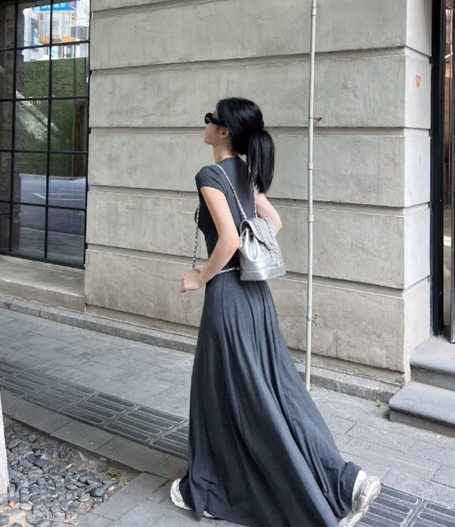 灰色t恤+灰色半身長裙,這種色調是真的非常百搭,也帶着高級噶,裙子的面料質感和垂墜感都是非常棒的,可以很好拉長腿部線條。同時裙子的面料也很透氣舒適。