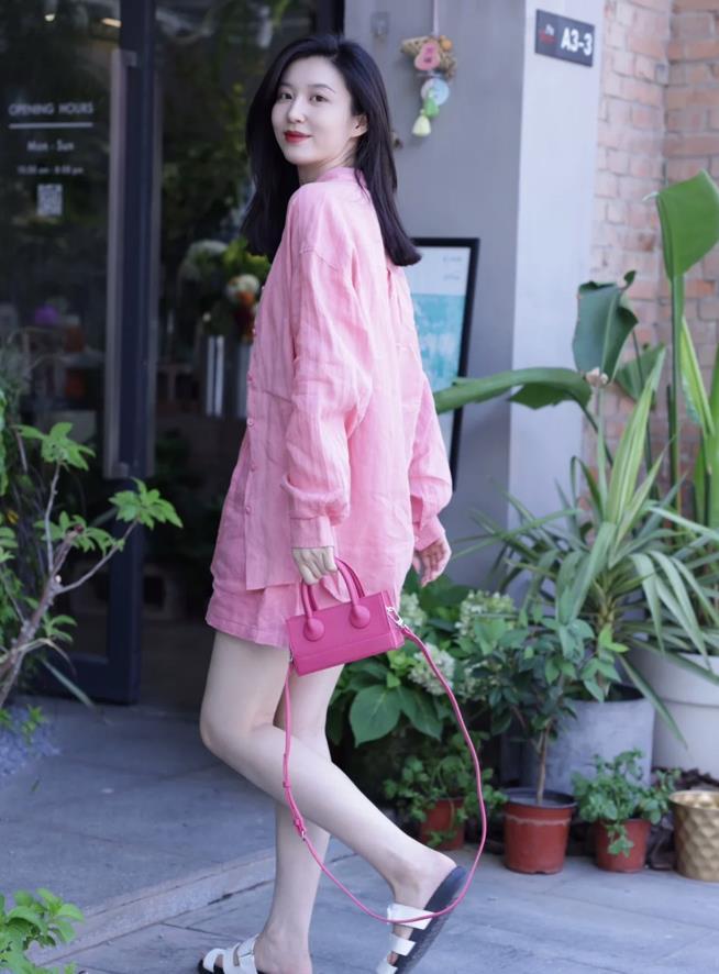 今年粉色系的搭配,實在是太流行了,粉嫩的顏色就是能讓人時刻擁有一顆少女心,這是一套可以讓人眼前一亮的粉色亞麻短褲套裝,舒適透氣,顏色是很顯白的粉色,亞麻材質帶着皺皺的質感,瞧着還挺高級的。