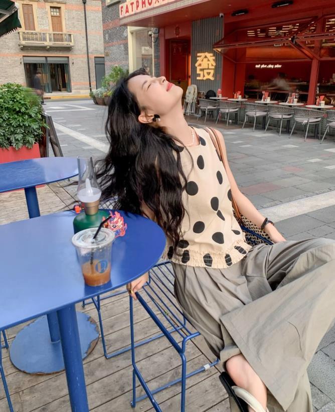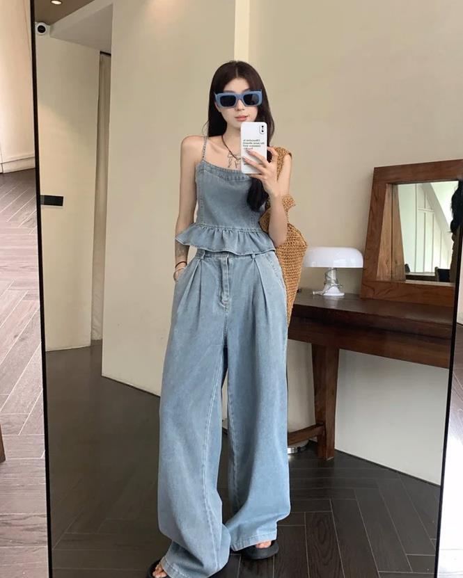 木耳邊的吊帶背心,搭配牛仔闊腿褲,整體看起來又甜又辣,夏天姐妹們就大膽穿起來吧!