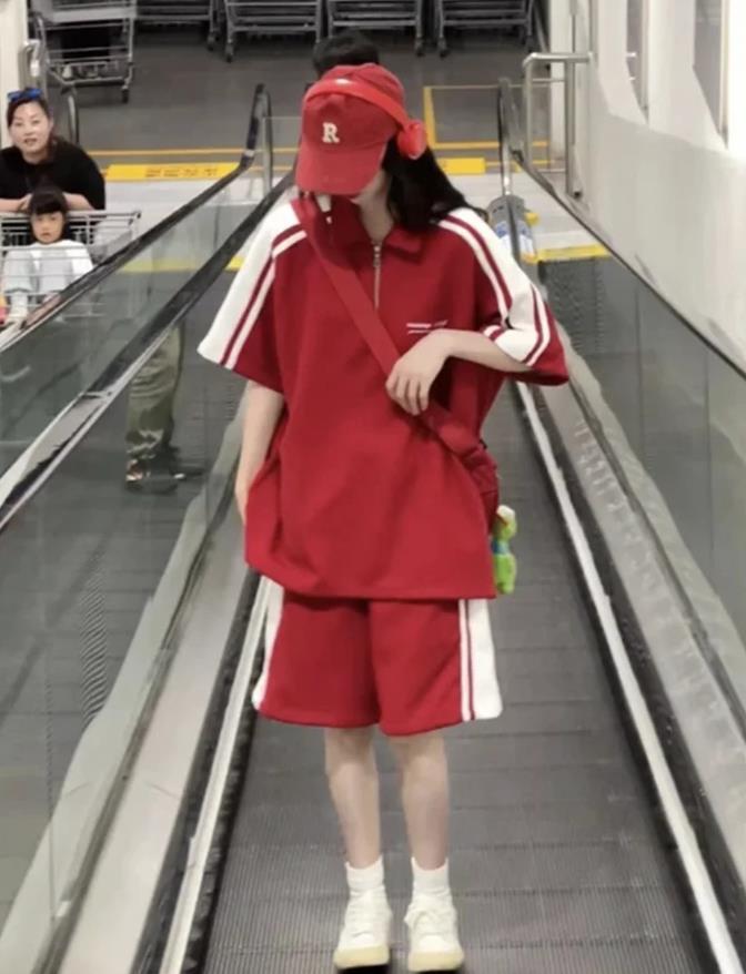 誰說紅色就不適合夏天了?這一套紅白拼色運動短褲套裝,面料舒服又寬鬆,上下的版型都是寬鬆的,對身材一點約束感都沒有,藏肉又顯瘦。腳下一雙白色運動鞋,瞬間降低了紅色的高調感。
