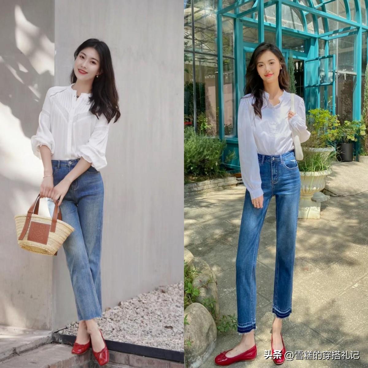 白色襯衫在春夏季節出鏡率也是極高的,相比起修身款式的職場風白襯衫,更推薦大家選擇廓形、落空設計、圓領款的白襯衫,用經典的藍色煙管褲搭配,十分養眼。