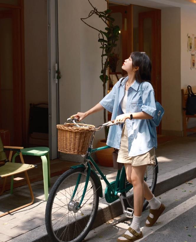 我想,大概沒有人會不喜歡那種自在鬆弛感的穿搭吧?這一套主打的就是一個舒適,很簡單的出門裝扮,寬鬆的藍色短袖襯衫,版型是大一號的,不是那種傳統的修身款,可以單穿,也可以在裏面疊穿一件t恤、小背心之類的。