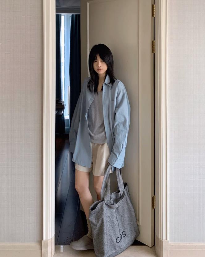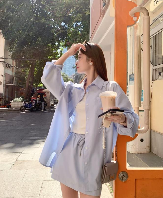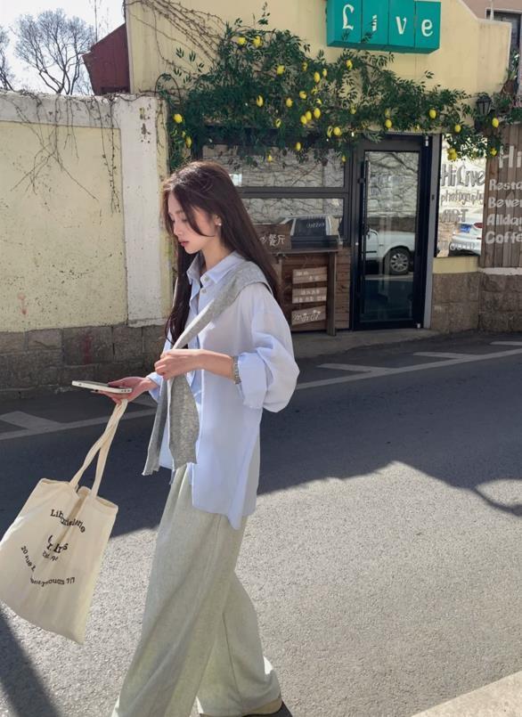 喜歡韓系風格着裝的姐妹,可以參考下這套,透氣性極佳、顏色又很清爽的淺藍色襯衫,利落剪裁+寬鬆版型,穿起來就是舒適自在,以及對身材的無限包容。