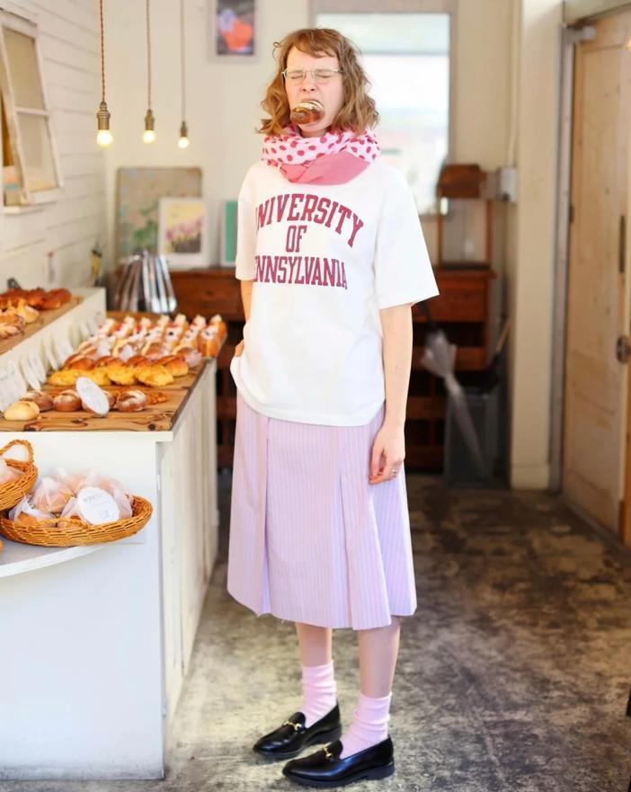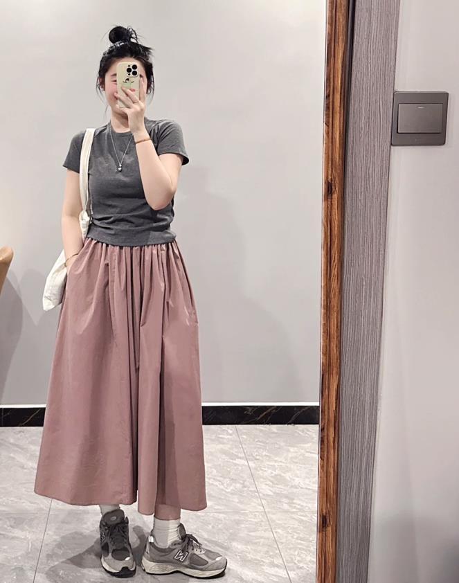 適合微胖梨形身材的穿搭,梅子色的半身長裙,這個色調是真的很喜歡,加上寬鬆的版型,一些胯寬、大腿粗的缺點也能得到遮掩。上衣可以選擇短款帶修身版型的t恤,上緊下松的組合,很好優化了身材比例。
