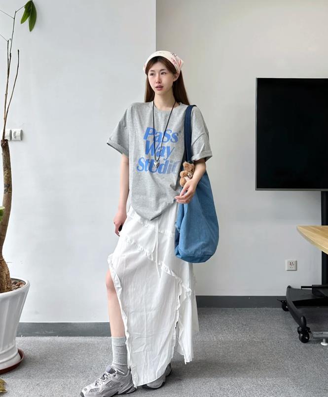 五一出遊姐妹們想好要怎麼去穿了嗎?鬆弛感的搭配就是最合適的,淺灰色短袖t恤,和白色、黑色都是很經典的款式,怎麼搭配都不會出錯。搭配一條靈動又清爽的白色半裙,開叉的設計,實在是太個性了,簡約又不失細節感。