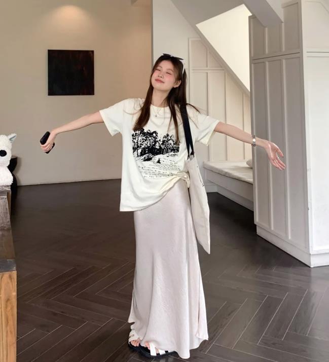 韓女們的穿搭鬆弛感,我徹底悟了,寬鬆又帶點復古範的短袖t恤,搭配緞面半身長裙,整體看起來也太顯瘦了。不過這種材質柔軟又貼身的面料,並不適合胯寬的身材穿,但是,你可以選擇長一點的t恤來穿,這樣有助於遮掩下身的不完美情況。