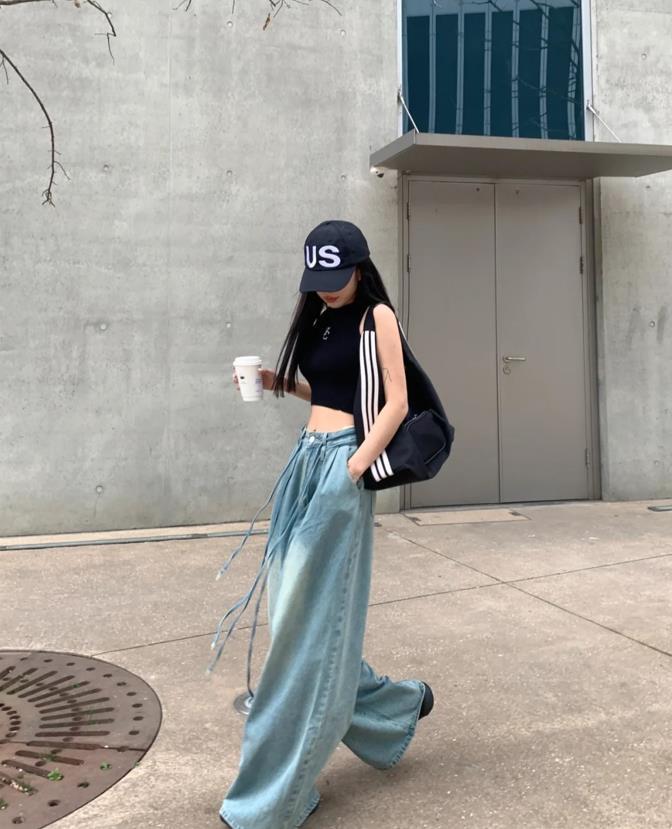 上緊下松的搭配組合,對於身材有着極佳的優化效果,不僅瘦身,還自帶一種休閒和隨性,黑色背心上衣+牛仔闊腿褲,精緻又鬆弛的感覺,增加一頂棒球帽進行點綴,又瞬間多了幾分酷颯感。