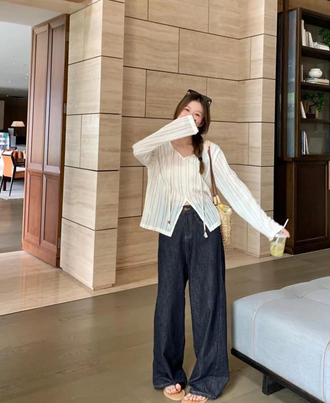 一直都很喜歡韓女範的穿搭,當與鬆弛感的搭配組合在一起,這休閒簡約的風格我悟了。不喜歡穿t恤、襯衫的姐妹,在夏季也可以嘗試下這種鏤空面料的針織衫,搭配寬鬆的闊腿牛仔褲,度假、逛街這樣穿太舒服了,一點都不會給人悶熱感。