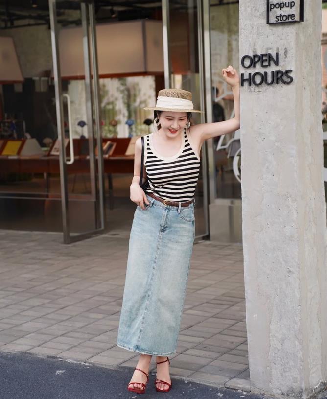 隨性舒適的穿搭就是帶着一種自然的美感,在夏日裏,鬆弛一點的着裝會更時尚,簡約的黑白條紋背心,搭配牛仔半裙,看似基礎的組合,卻難得呈現出自在的狀態。